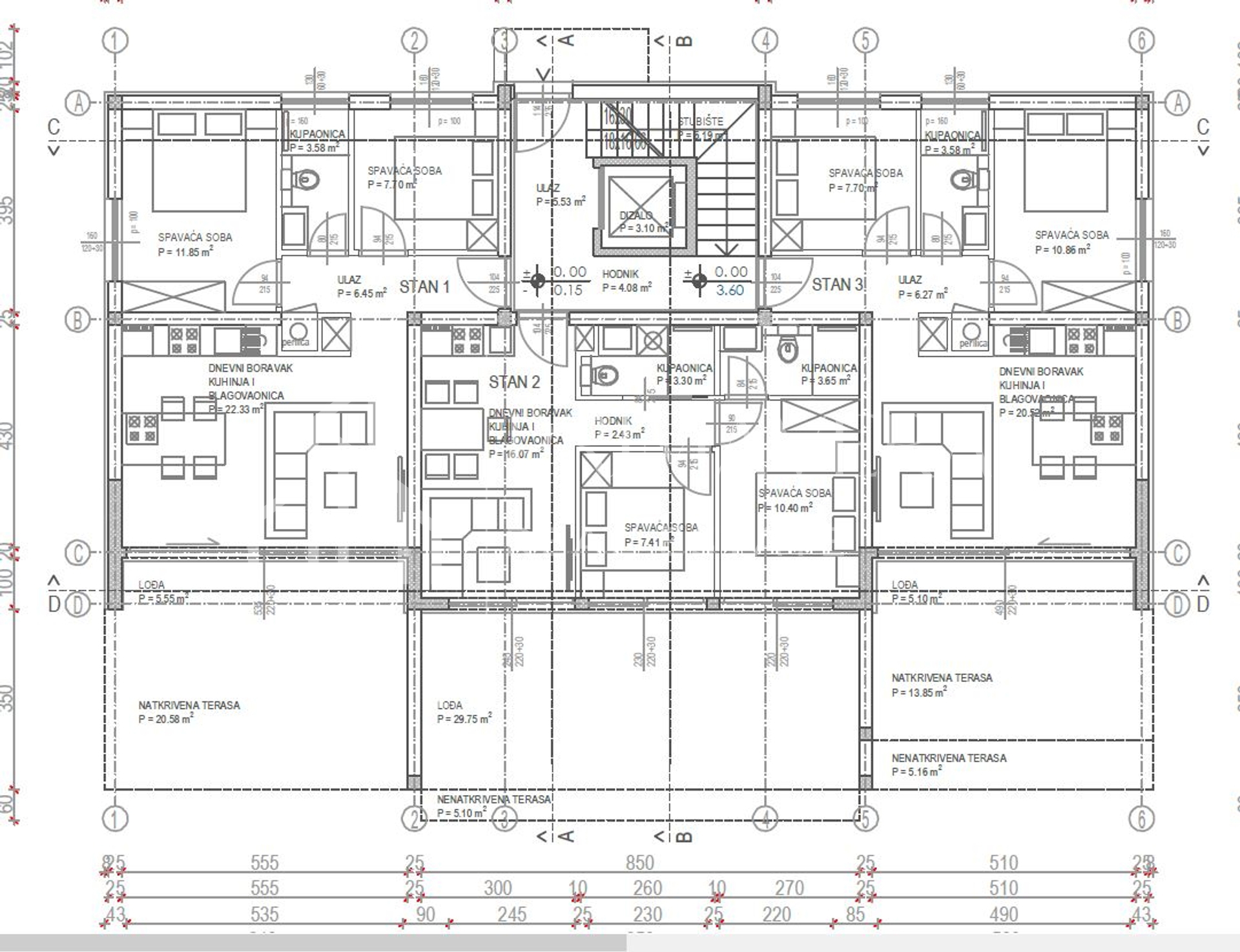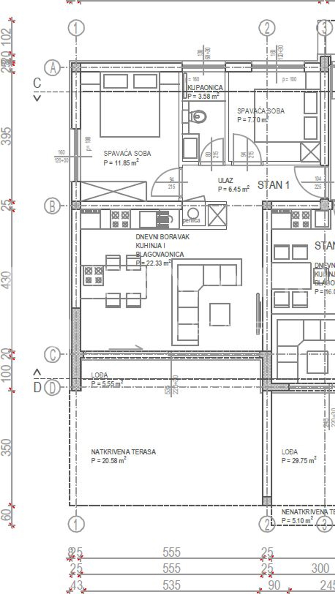 The apartment marked S1 is located on the ground floor of the building. It contains two bedrooms, a bathroom, a kitchen with a dining room and a living room with access to the terrace, with a total net area of 66.36 m2. It has a partial sea view. It also has it's own garden next to the apartment, floor plan area 29 m2 (net 2.90 m2). The total net area of the apartment and garden is 69.51 m2. This apartment also includes two parking spaces on the property of the building with a total area of 28.60 m2 (net 7.15 m2), so the total net area of the apartment and all accessories is 76.41 m2. An excellent location for vacation, the distance to the sea is only about 20 meters.