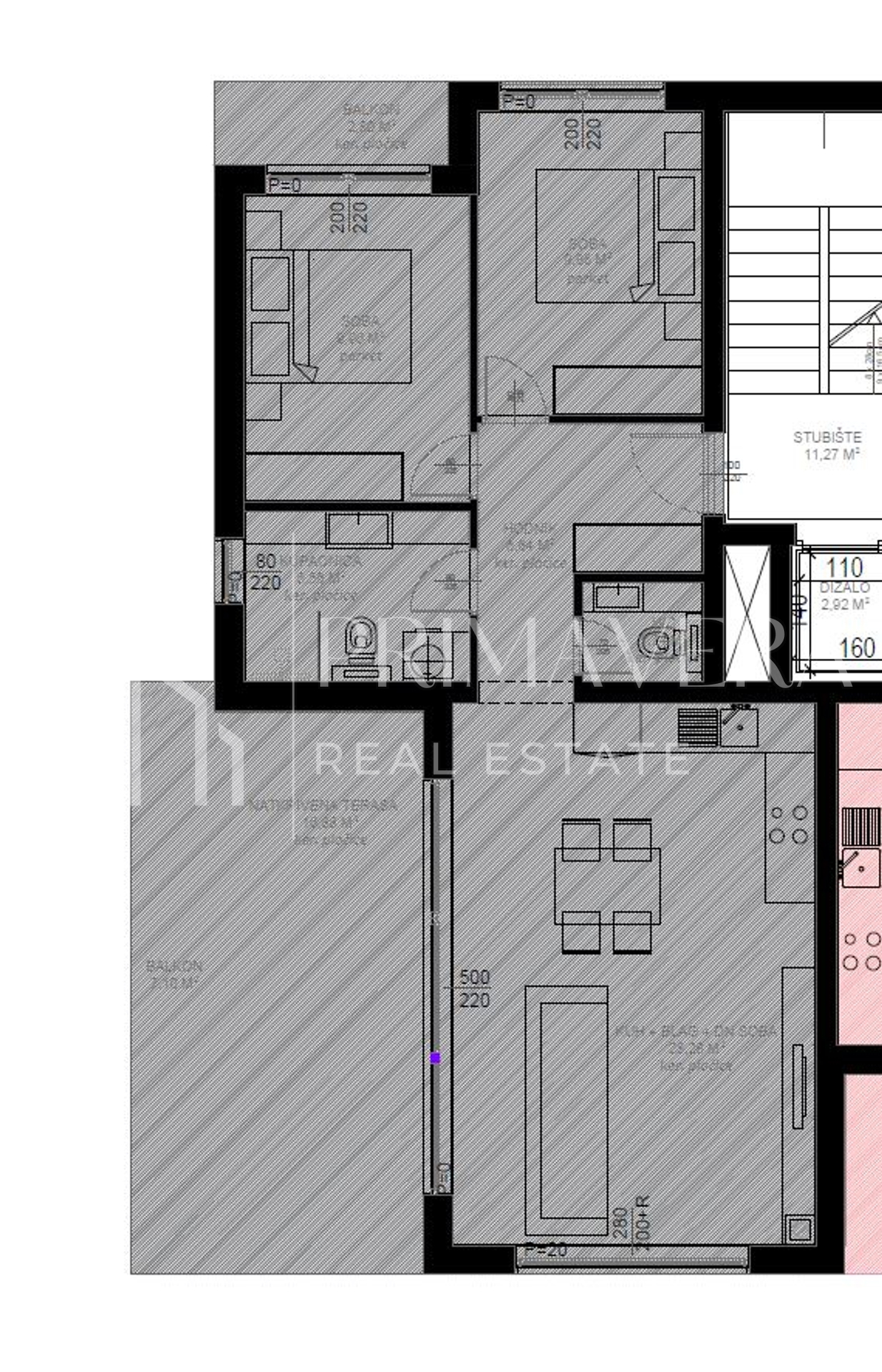 There are a total of 12 apartments in the building. The building has an elevator. The exterior joinery is three-layer PVC, with mosquito nets and electric blinds. The entrance door will be burglar-proof and fire-proof with a video intercom. Underfloor heating will be installed in the bathrooms and toilets, while heating and cooling in other rooms is provided by air conditioners in each bedroom and in the living room. Floor coverings will be laminate and ceramic tiles. The building will be covered with 10 cm thick thermal insulation, which will result in an A+ energy certificate. High-quality materials are used in the construction, in accordance with the highest construction standards. Modern design and quality construction will satisfy even the most demanding customers. Completion of the project and occupancy is scheduled for spring 2025.