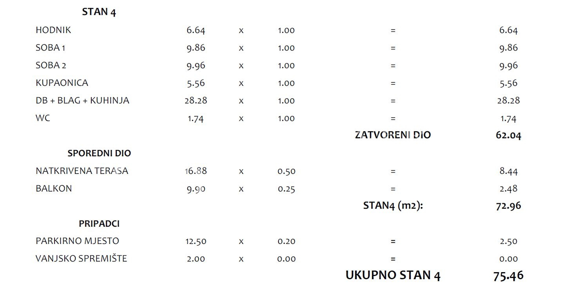 Apartment S4, on the 1st floor of the building, consists of a hallway, a kitchen with a dining room and a living room, two bedrooms, a covered terrace, a bathroom and a separate toilet. It has an outdoor parking space and a storage room. The net living area of ​​the apartment is 72.95 m2. The total calculation area of ​​the apartment and accessories is 75.46 m2.