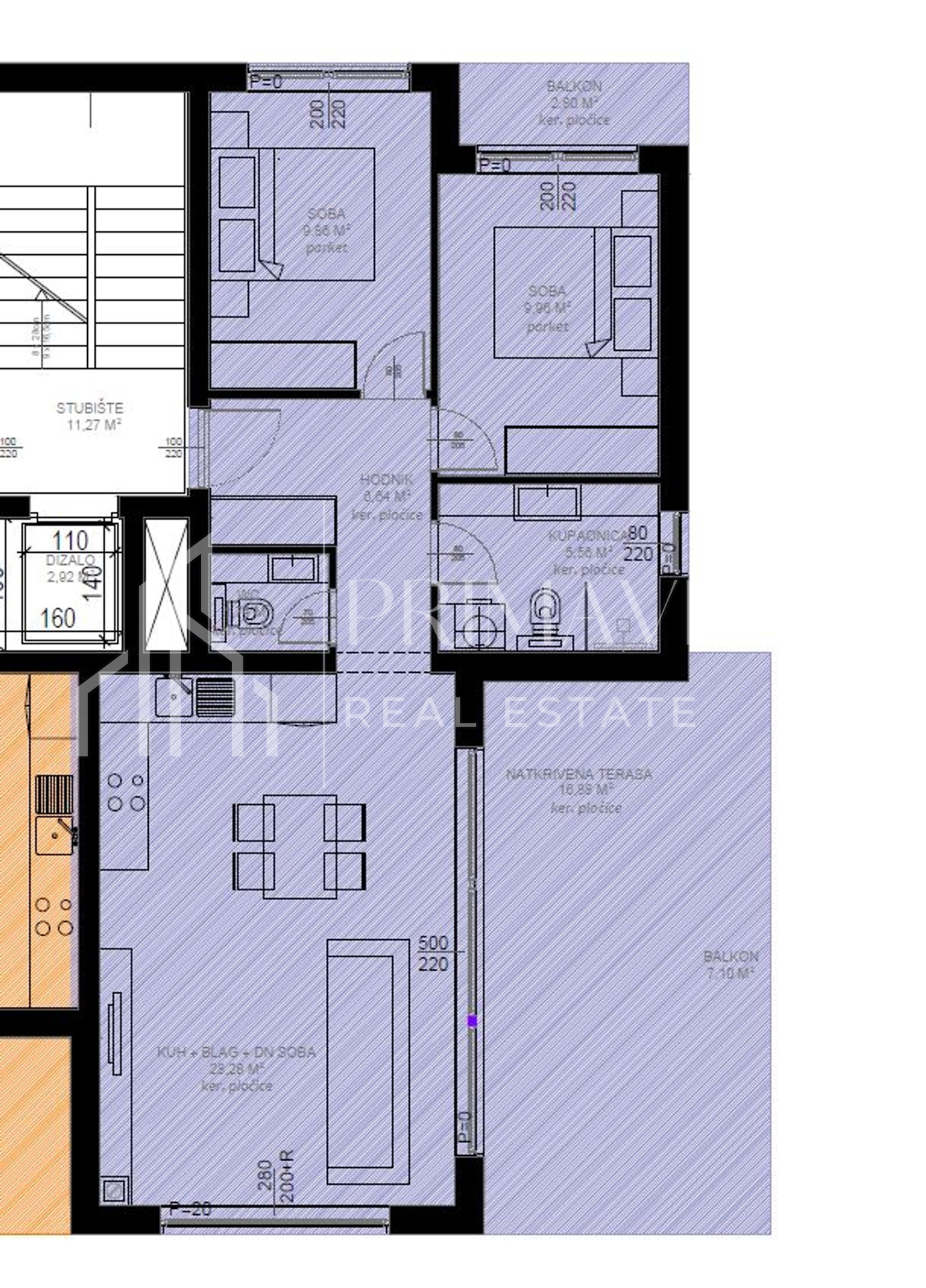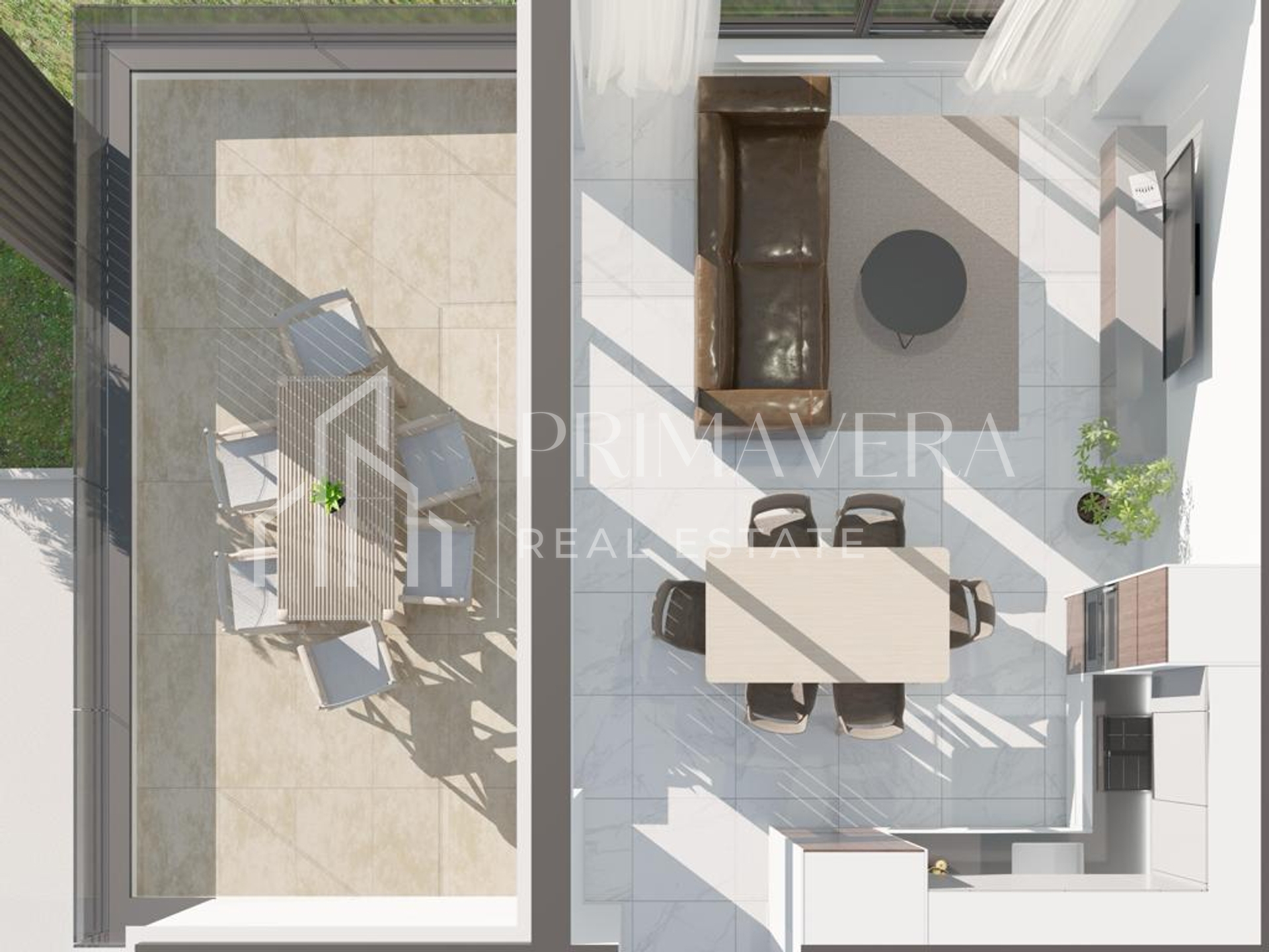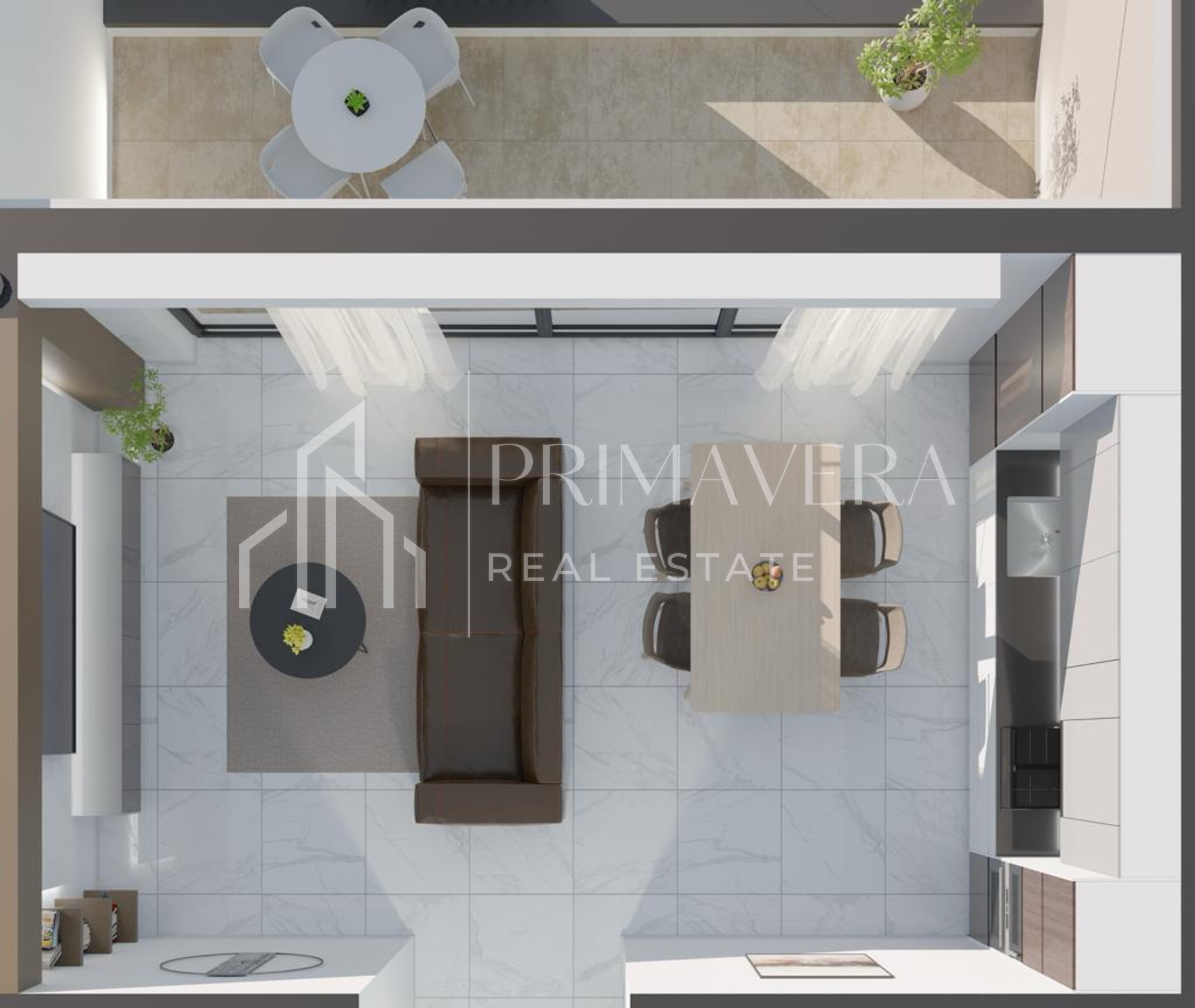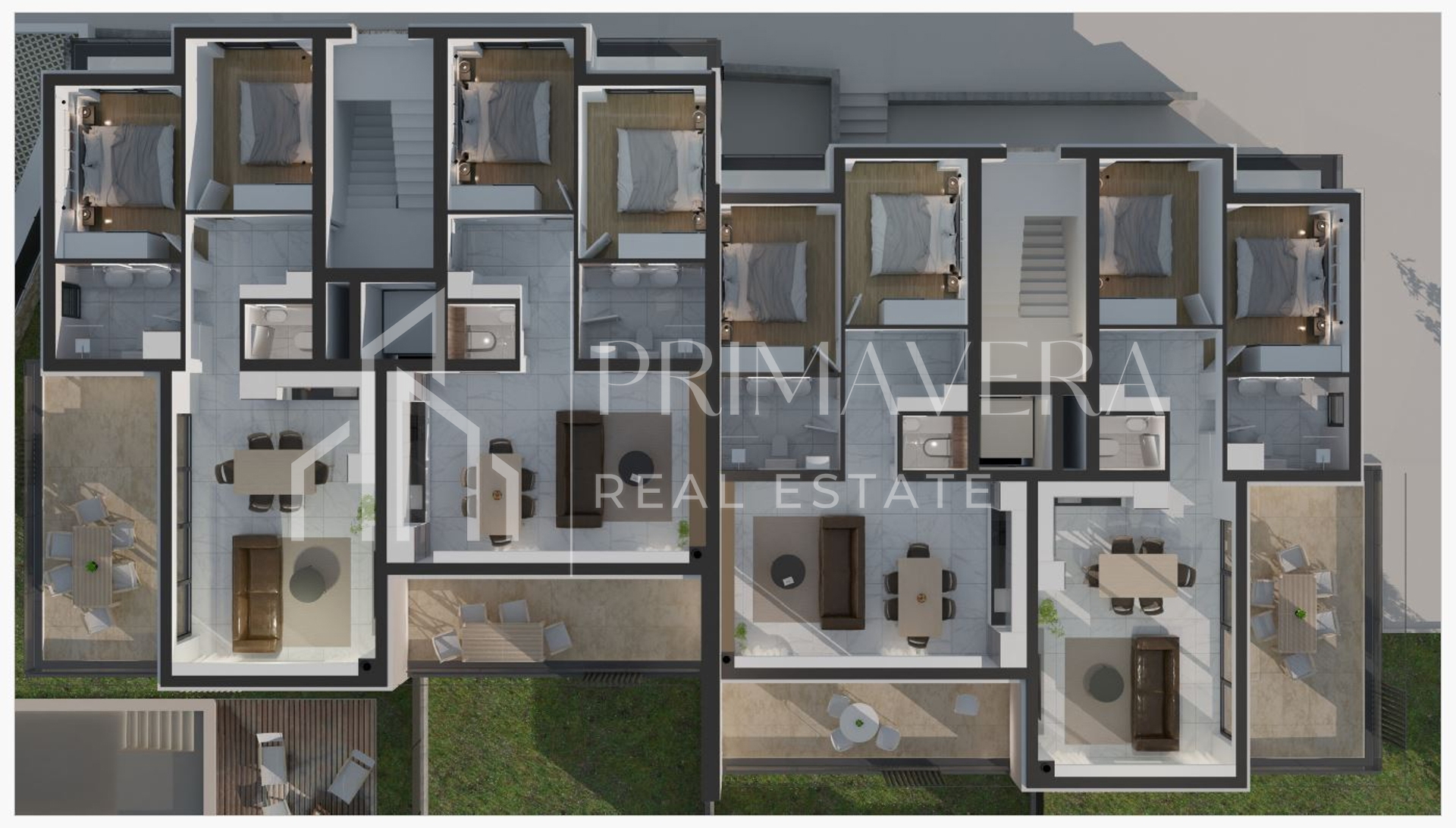 There are a total of 12 apartments in the building. The building has an elevator. The exterior joinery is three-layer PVC, with mosquito nets and electric blinds. The entrance door will be burglar-proof and fire-proof with a video intercom. Underfloor heating will be installed in the bathrooms and toilets, while heating and cooling in other rooms is provided by air conditioners in each bedroom and in the living room. Floor coverings will be laminate and ceramic tiles. The building will be covered with 10 cm thick thermal insulation, which will result in an A+ energy certificate. High-quality materials are used in the construction, in accordance with the highest construction standards. Modern design and quality construction will satisfy even the most demanding customers. Completion of the project and occupancy is scheduled for spring 2025.