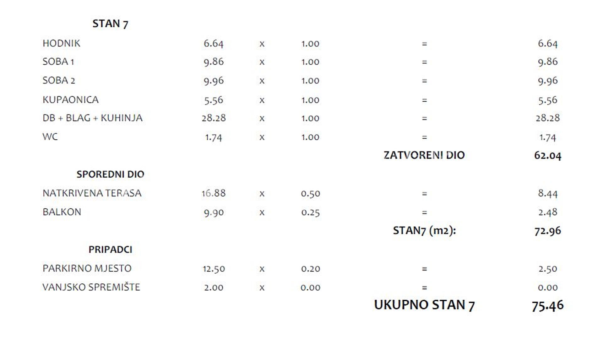 Apartment S7, on the 1st floor of the building, consists of a hallway, a kitchen with a dining room and a living room, two loggias, two bedrooms, a bathroom and a separate toilet. It has an outdoor parking space and a storage room. The net living area of ​​the apartment is 72.96 m2. The total calculation area of ​​the apartment and accessories is 75.46 m2.