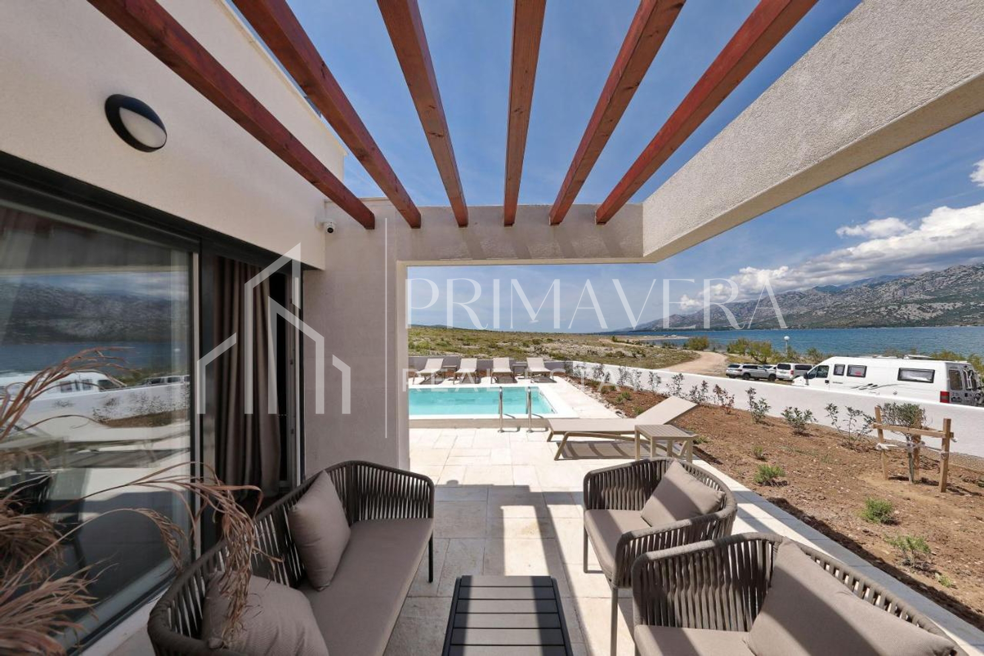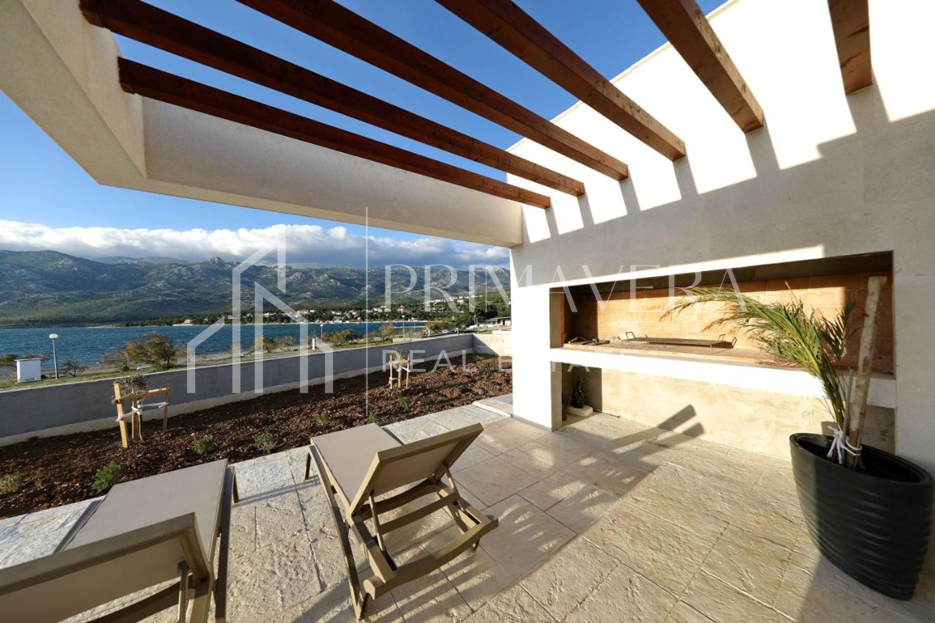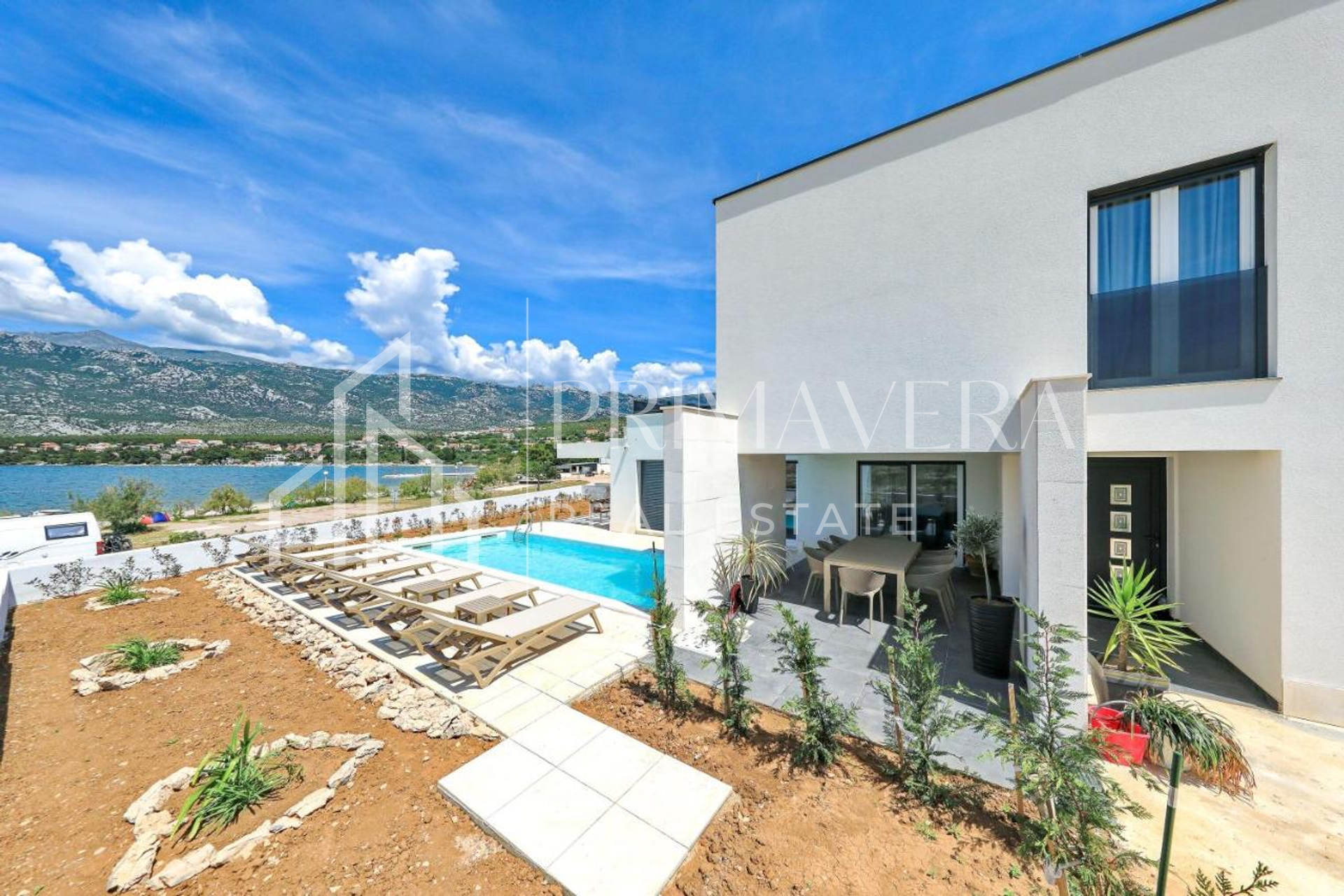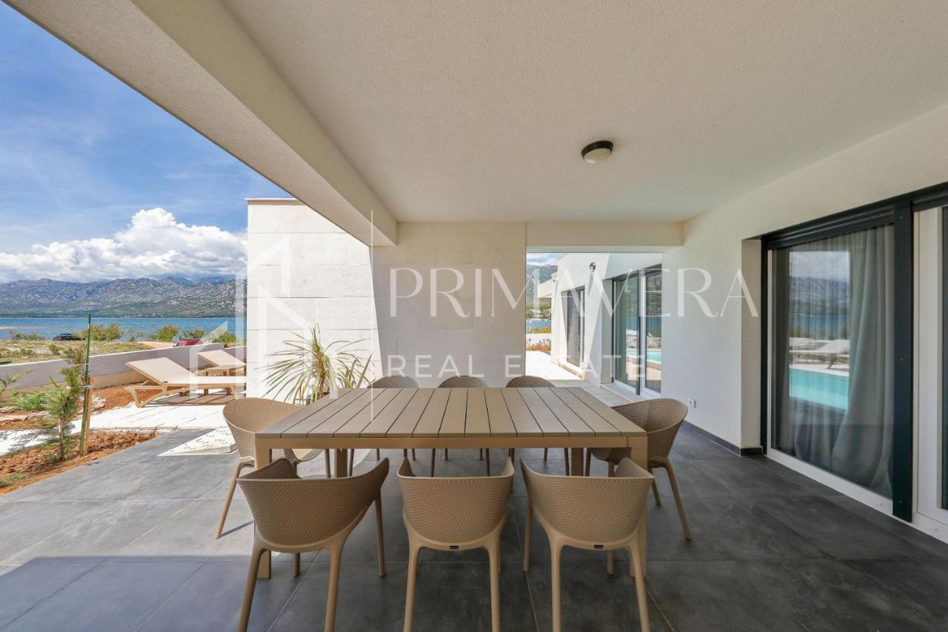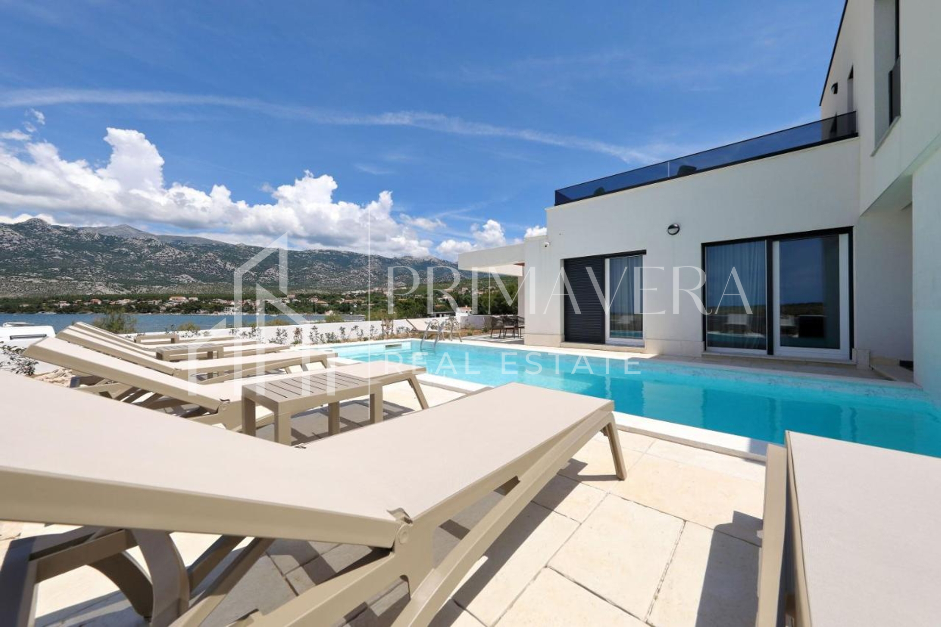 A beautiful new villa with pool for sale in Rovanjska, first row to the sea. The house consists of a ground floor and a first floor. The total living area is 182 m2, and it was built on a plot of land of 477 m2. The ground floor of the villa contains a hallway, a study/bedroom, a bathroom and an open-concept kitchen, dining room and living room. The dining room and the living room have access to two covered terraces with a beautiful view of the sea and the Velebit mountain. An internal staircase leads to the first floor where there are three additional bedrooms with their own bathrooms. All rooms are air-conditioned. There is a swimming pool in the spacious yard, and the yard is landscaped with grass and Mediterranean plants. On one of the covered terraces there is a modern outdoor grill, connected to the dining room and kitchen. Large glass walls allow ventilation and a large amount of daylight.