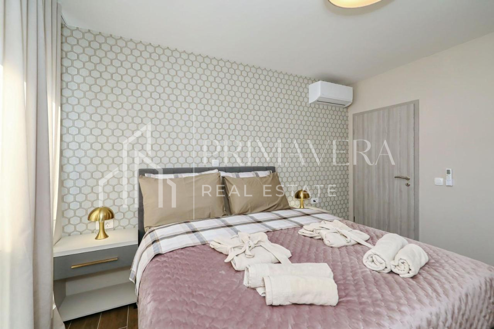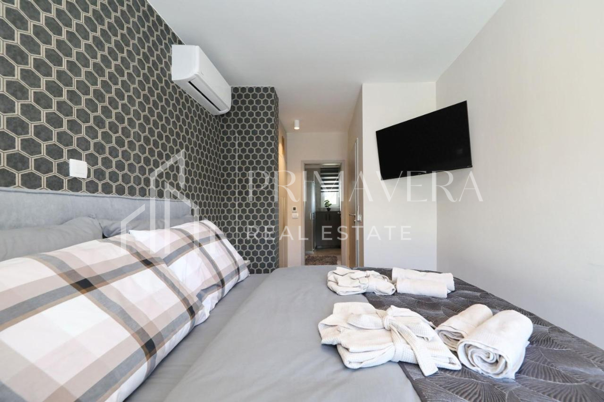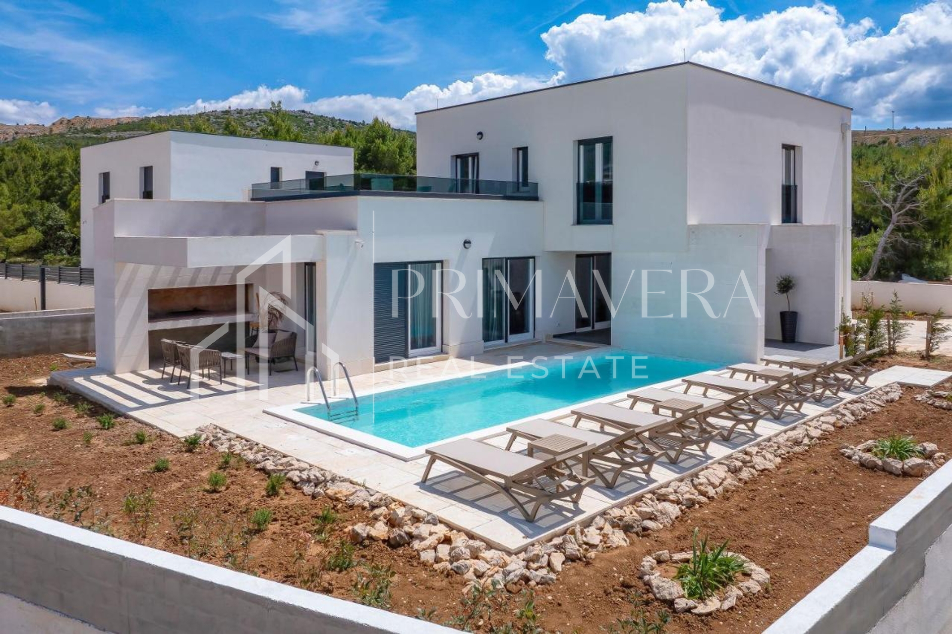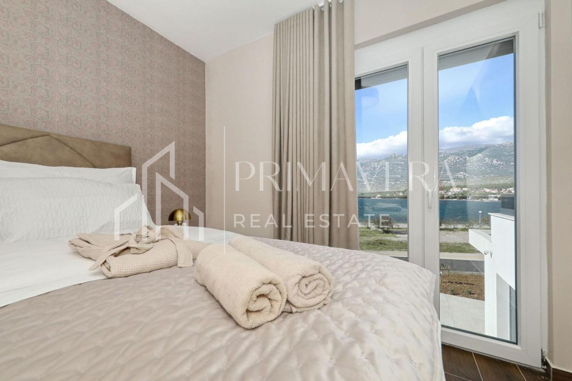 A beautiful new villa with pool for sale in Rovanjska, first row to the sea. The house consists of a ground floor and a first floor. The total living area is 182 m2, and it was built on a plot of land of 477 m2. The ground floor of the villa contains a hallway, a study/bedroom, a bathroom and an open-concept kitchen, dining room and living room. The dining room and the living room have access to two covered terraces with a beautiful view of the sea and the Velebit mountain. An internal staircase leads to the first floor where there are three additional bedrooms with their own bathrooms. All rooms are air-conditioned. There is a swimming pool in the spacious yard, and the yard is landscaped with grass and Mediterranean plants. On one of the covered terraces there is a modern outdoor grill, connected to the dining room and kitchen. Large glass walls allow ventilation and a large amount of daylight.