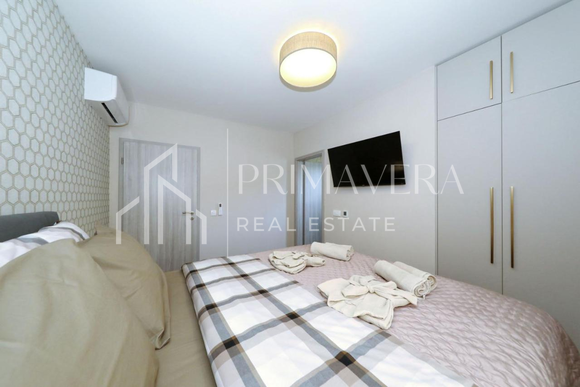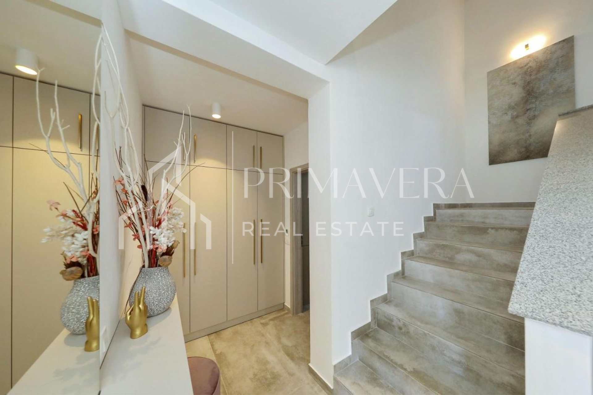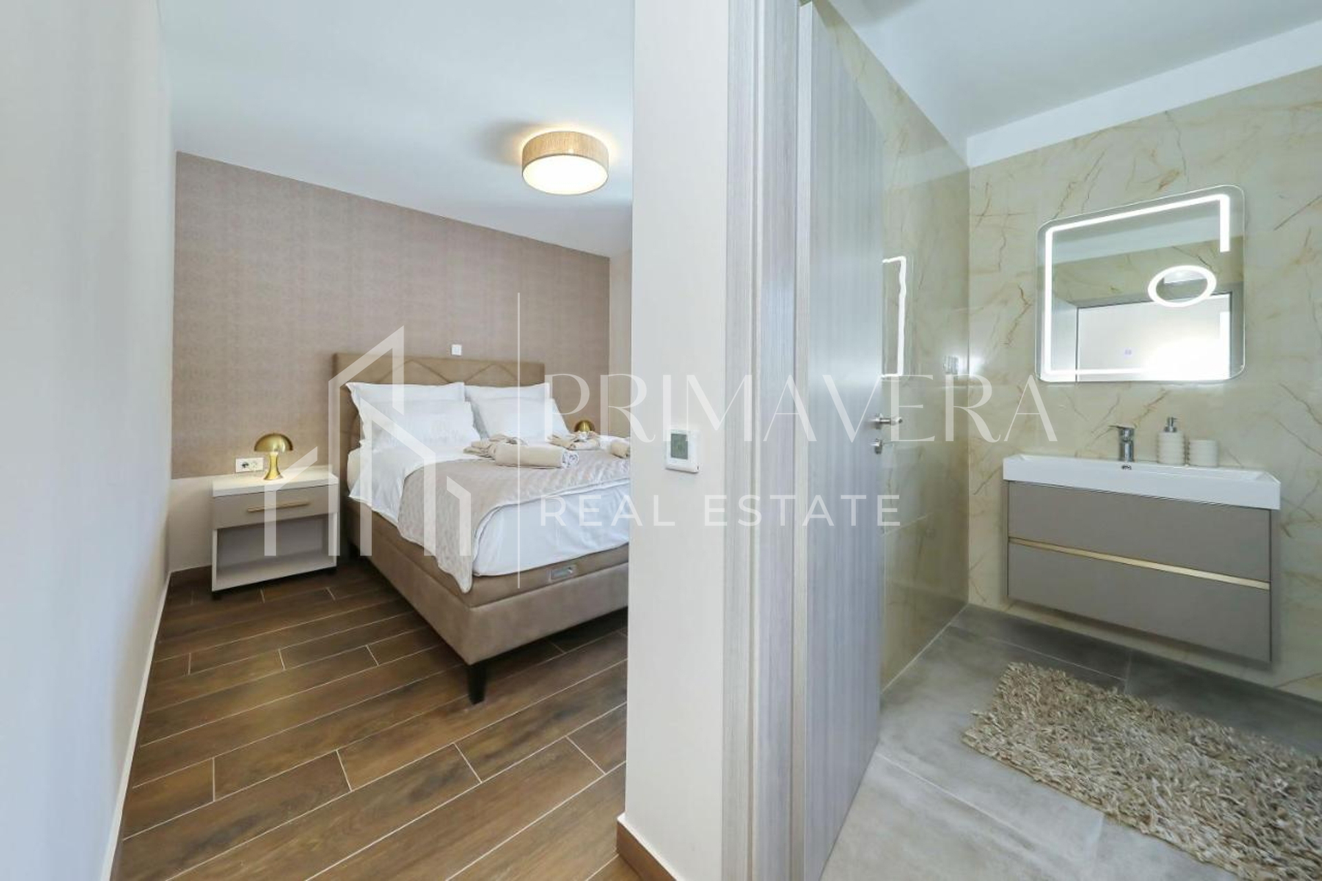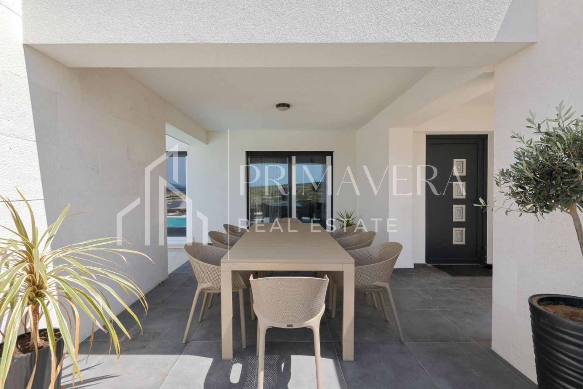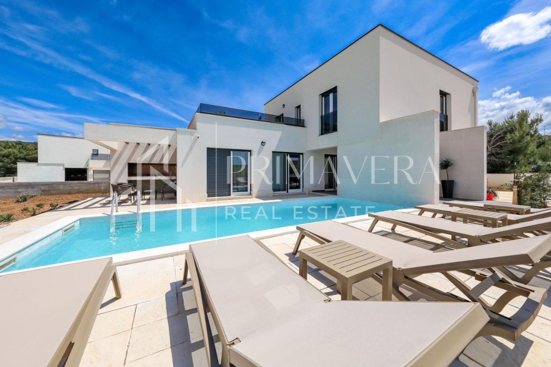 A beautiful new villa with pool for sale in Rovanjska, first row to the sea. The house consists of a ground floor and a first floor. The total living area is 182 m2, and it was built on a plot of land of 477 m2. The ground floor of the villa contains a hallway, a study/bedroom, a bathroom and an open-concept kitchen, dining room and living room. The dining room and the living room have access to two covered terraces with a beautiful view of the sea and the Velebit mountain. An internal staircase leads to the first floor where there are three additional bedrooms with their own bathrooms. All rooms are air-conditioned. There is a swimming pool in the spacious yard, and the yard is landscaped with grass and Mediterranean plants. On one of the covered terraces there is a modern outdoor grill, connected to the dining room and kitchen. Large glass walls allow ventilation and a large amount of daylight.