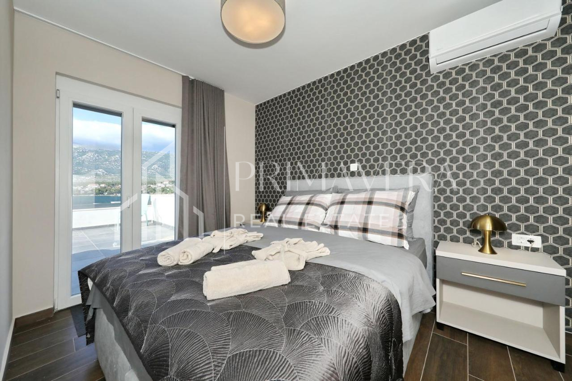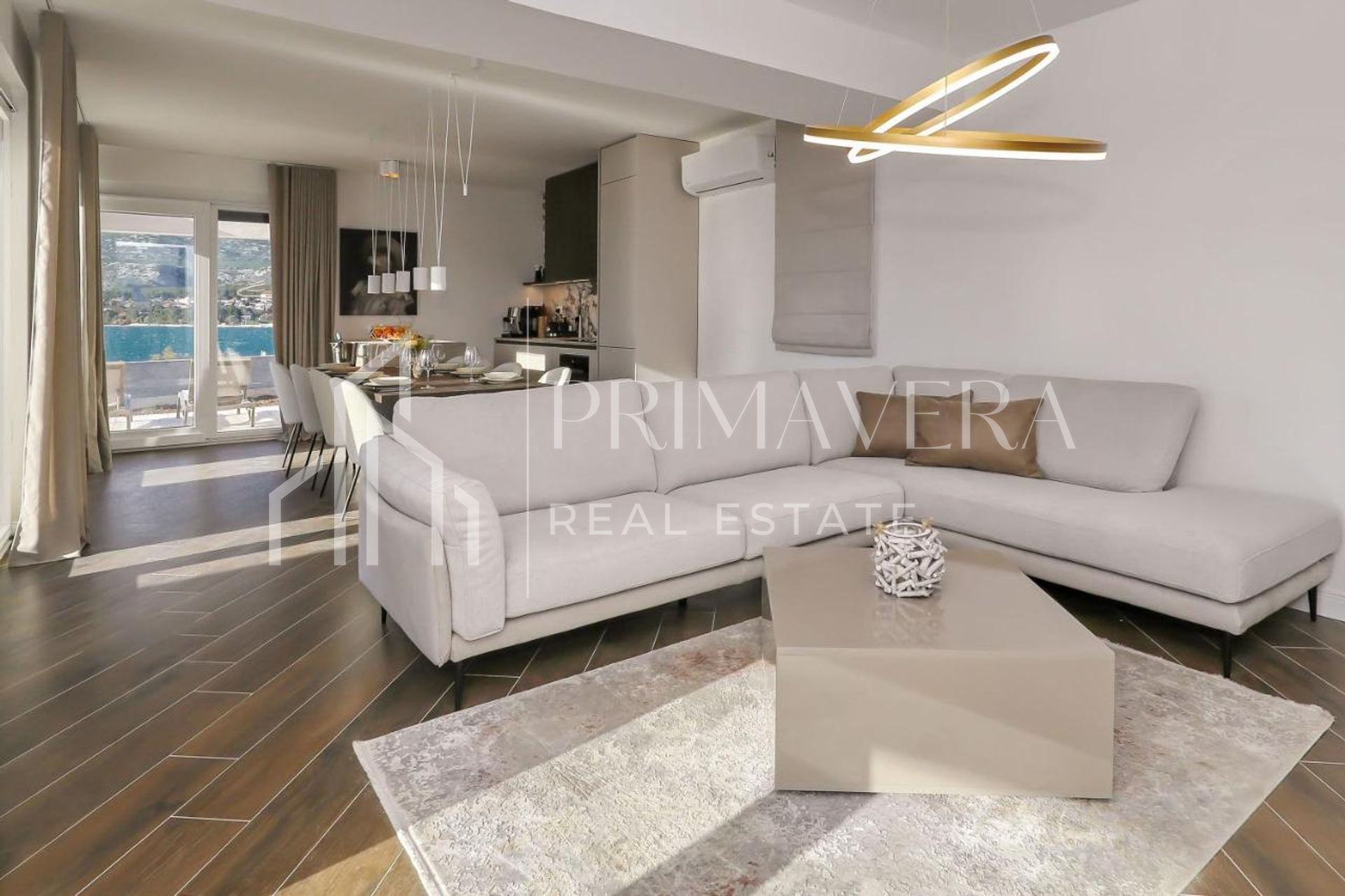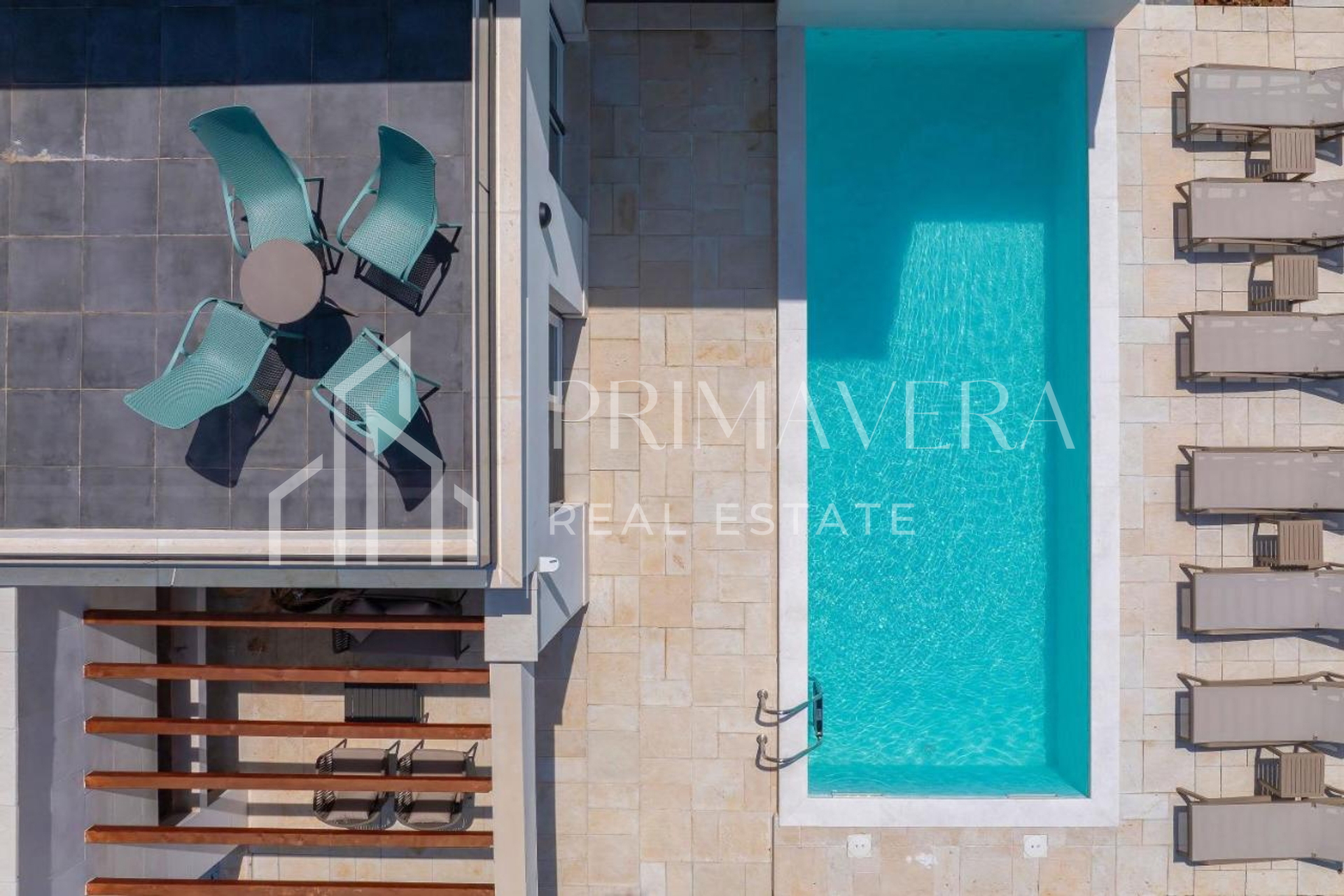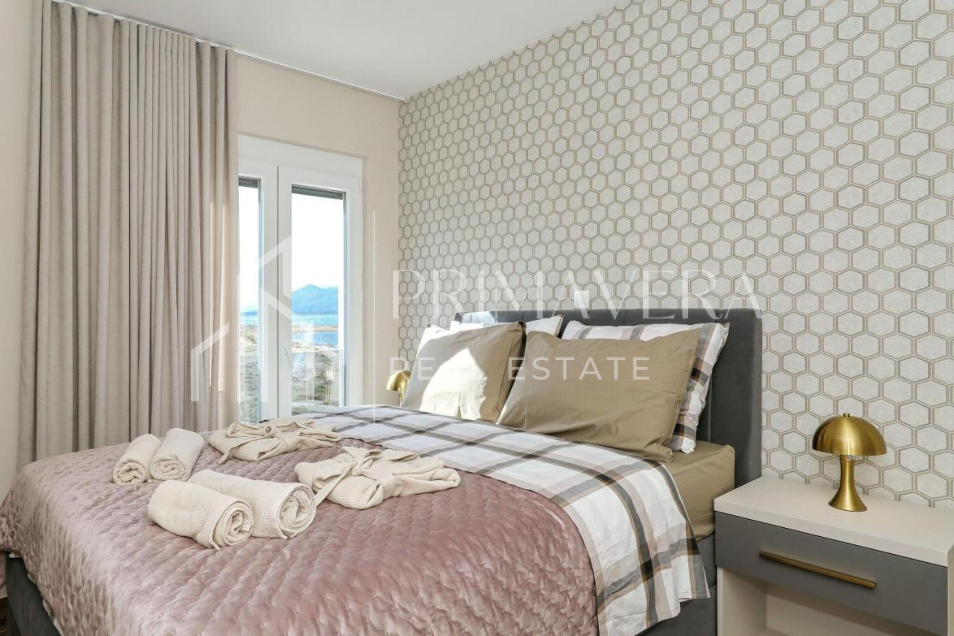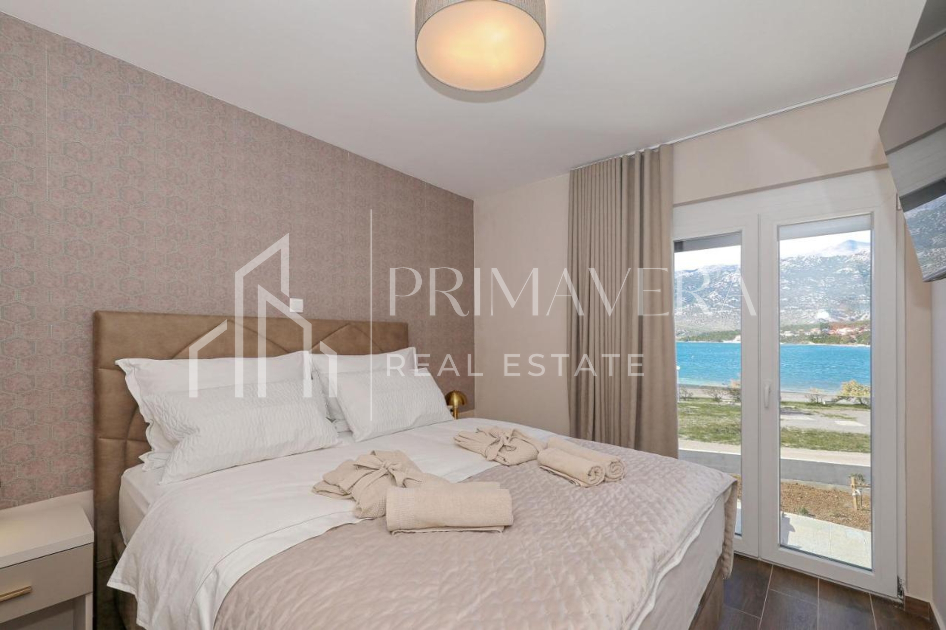 A beautiful new villa with pool for sale in Rovanjska, first row to the sea. The house consists of a ground floor and a first floor. The total living area is 182 m2, and it was built on a plot of land of 477 m2. The ground floor of the villa contains a hallway, a study/bedroom, a bathroom and an open-concept kitchen, dining room and living room. The dining room and the living room have access to two covered terraces with a beautiful view of the sea and the Velebit mountain. An internal staircase leads to the first floor where there are three additional bedrooms with their own bathrooms. All rooms are air-conditioned. There is a swimming pool in the spacious yard, and the yard is landscaped with grass and Mediterranean plants. On one of the covered terraces there is a modern outdoor grill, connected to the dining room and kitchen. Large glass walls allow ventilation and a large amount of daylight.