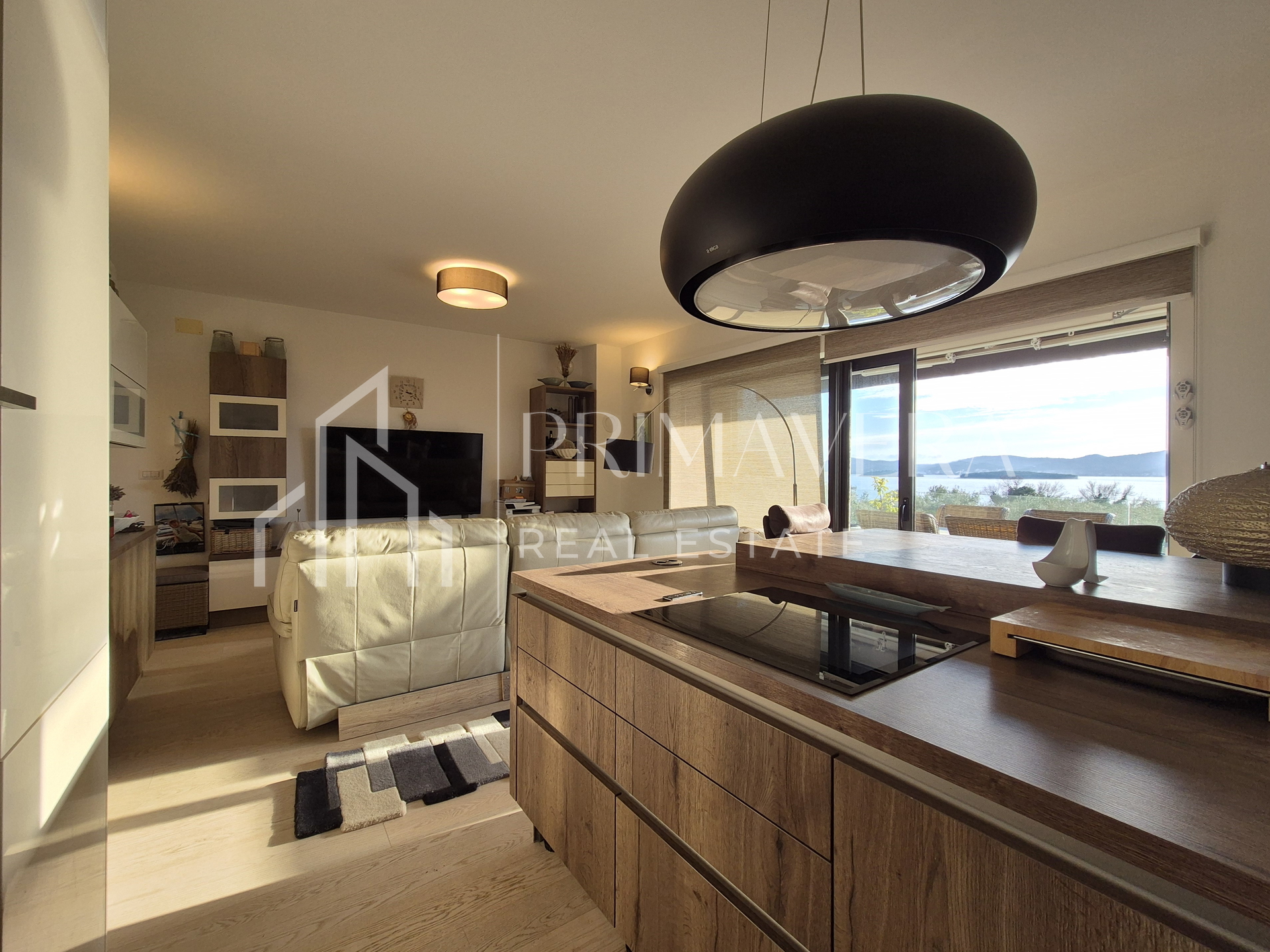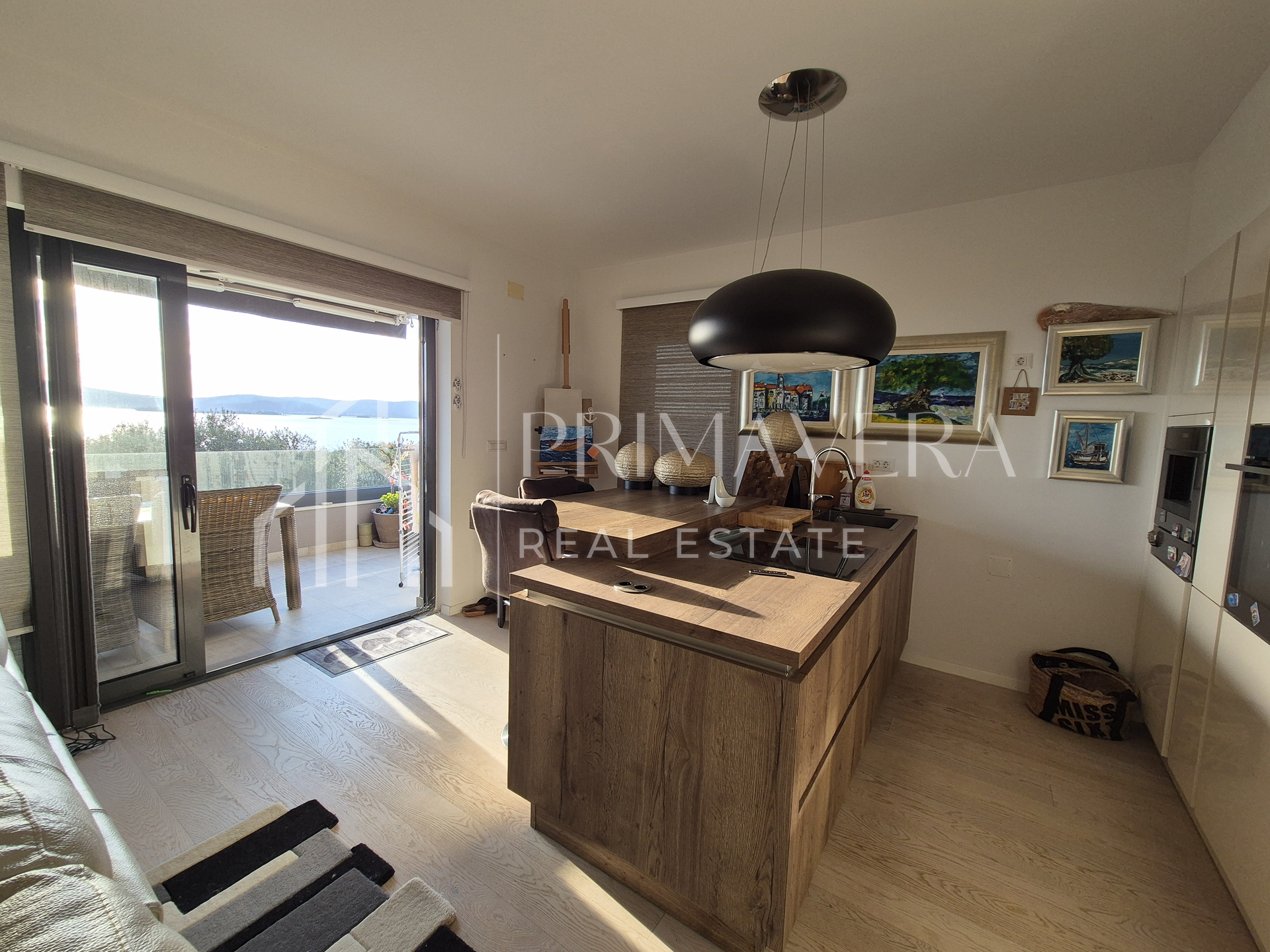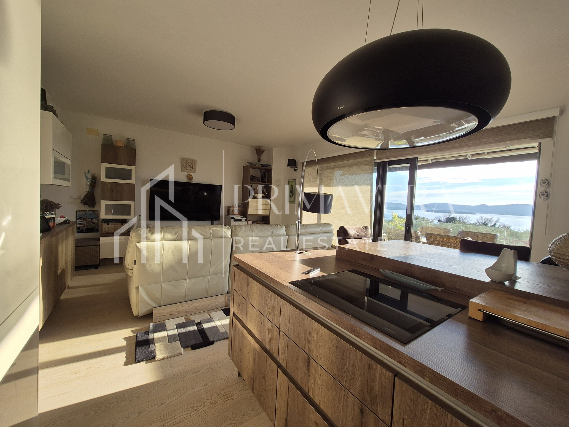 A spacious two-bedroom apartment for sale in Sv. Filip i Jakov, located on the 1st floor of a newer residential building. The apartment consists of a hallway/entrance hall, a kitchen with a dining room and a living room with access to a spacious covered terrace, two bedrooms, a bathroom and a separate toilet. The living area of ​​the apartment and the terrace offer a beautiful open view of the sea.