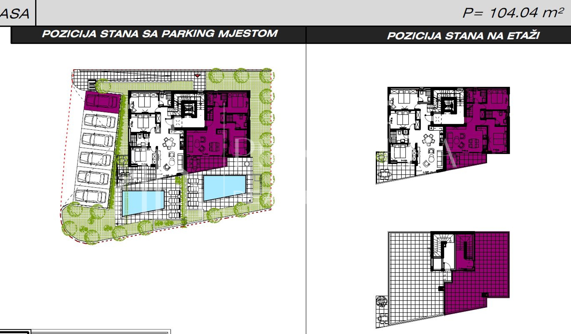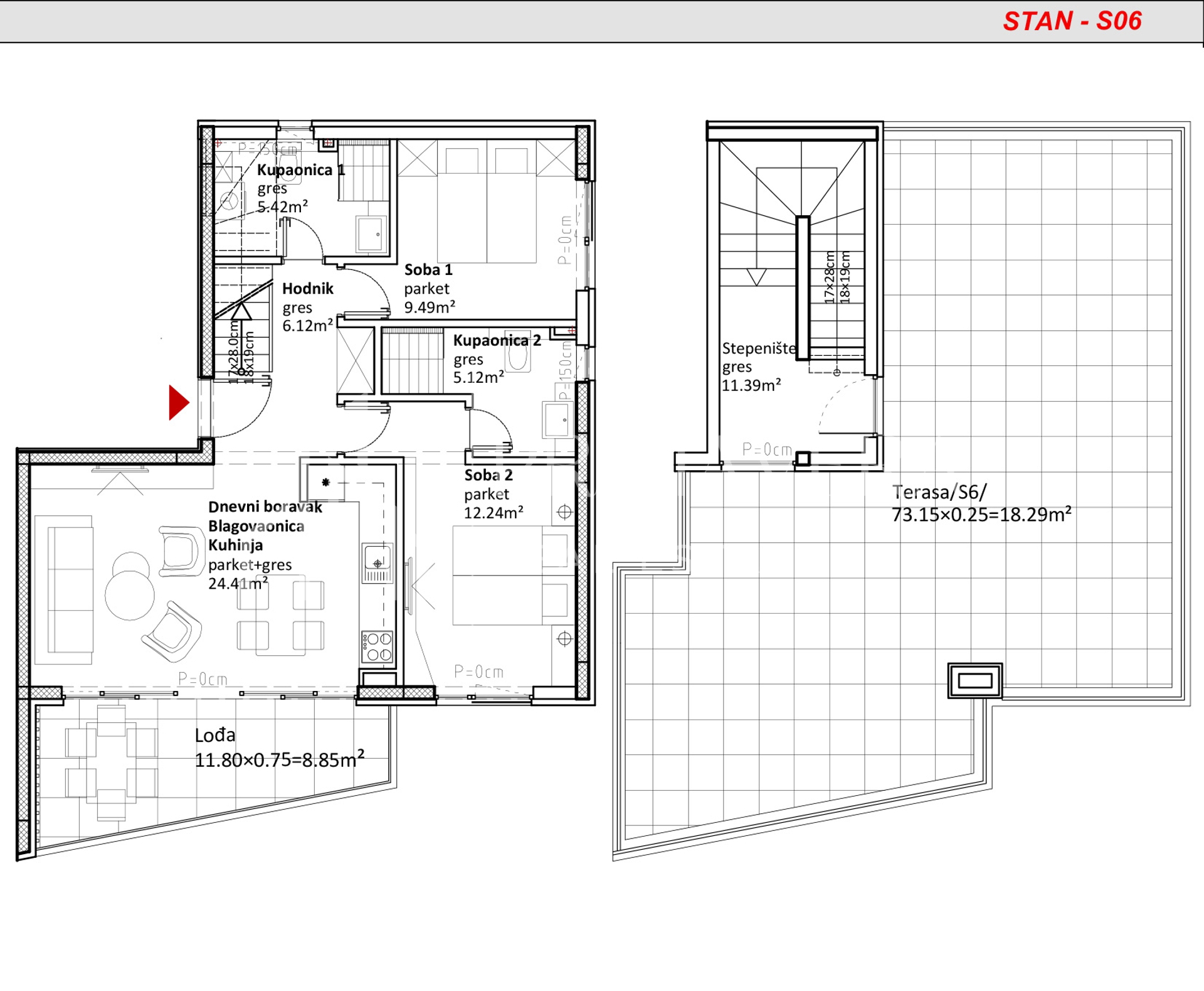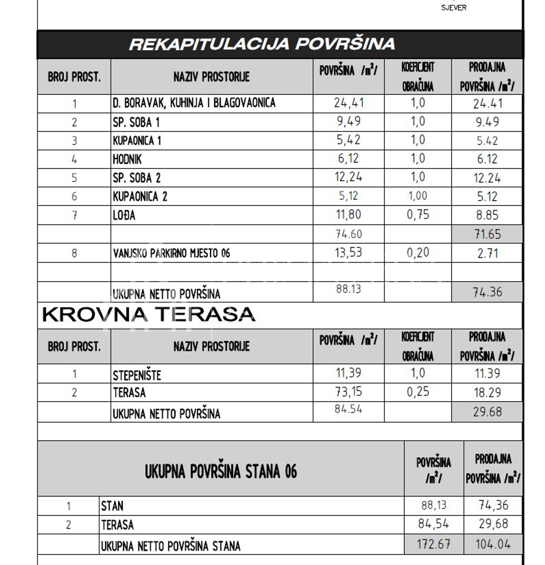 Two bedroom apartment with roof terrace, total net area 104.04 m2 on the 2nd floor of building 2, with a total of 6 residential units. The apartment marked S06 consists of a hallway, two bathrooms, two bedrooms, a living room with a kitchen and a dining room, a loggia and a private roof terrace of 73.15 m2 with a wonderful open view of the sea. The apartment also has an outdoor parking space.