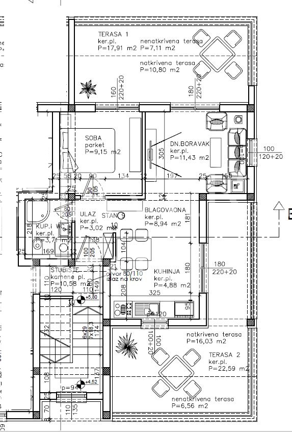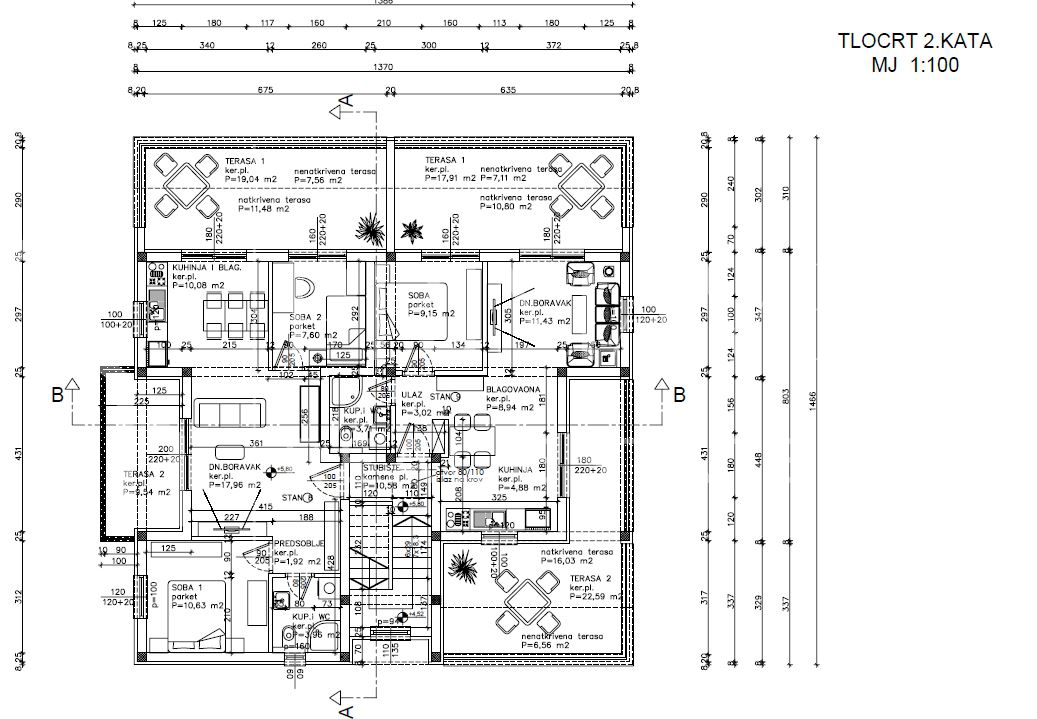 Stan oznake S9, na 2. katu zgrade, sadrži ulaz (3,02 m2), dnevni boravak s blagovaonicom i kuhinjom (17,85 m2), spavaću sobu (9,15 m2), kupaonicu (3,88 m2) te dvije natkrivene terase (17,9 m2 i 22,59 m2). Netto stambena površina stana iznosi 61,39 m2. Pripada mu i ostava u podrumu zgrade te jedno vanjsko parkirno mjesto. Ukupna obračunska površina stana i pripadaka iznosi 69,04 m2.