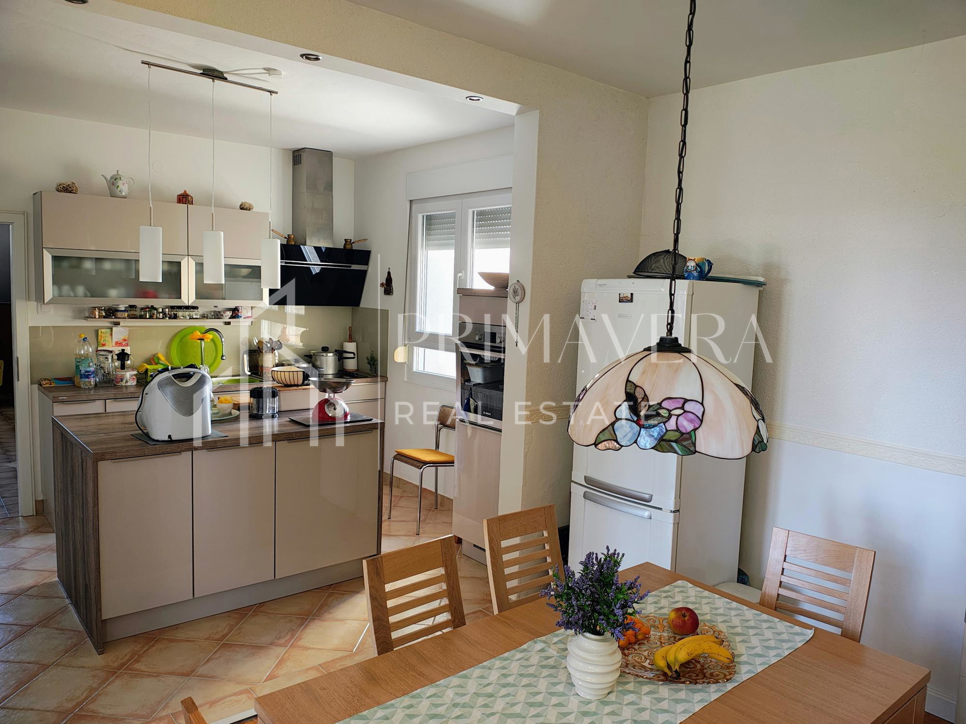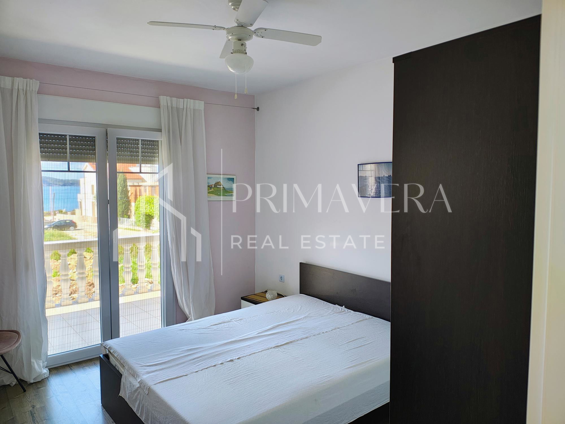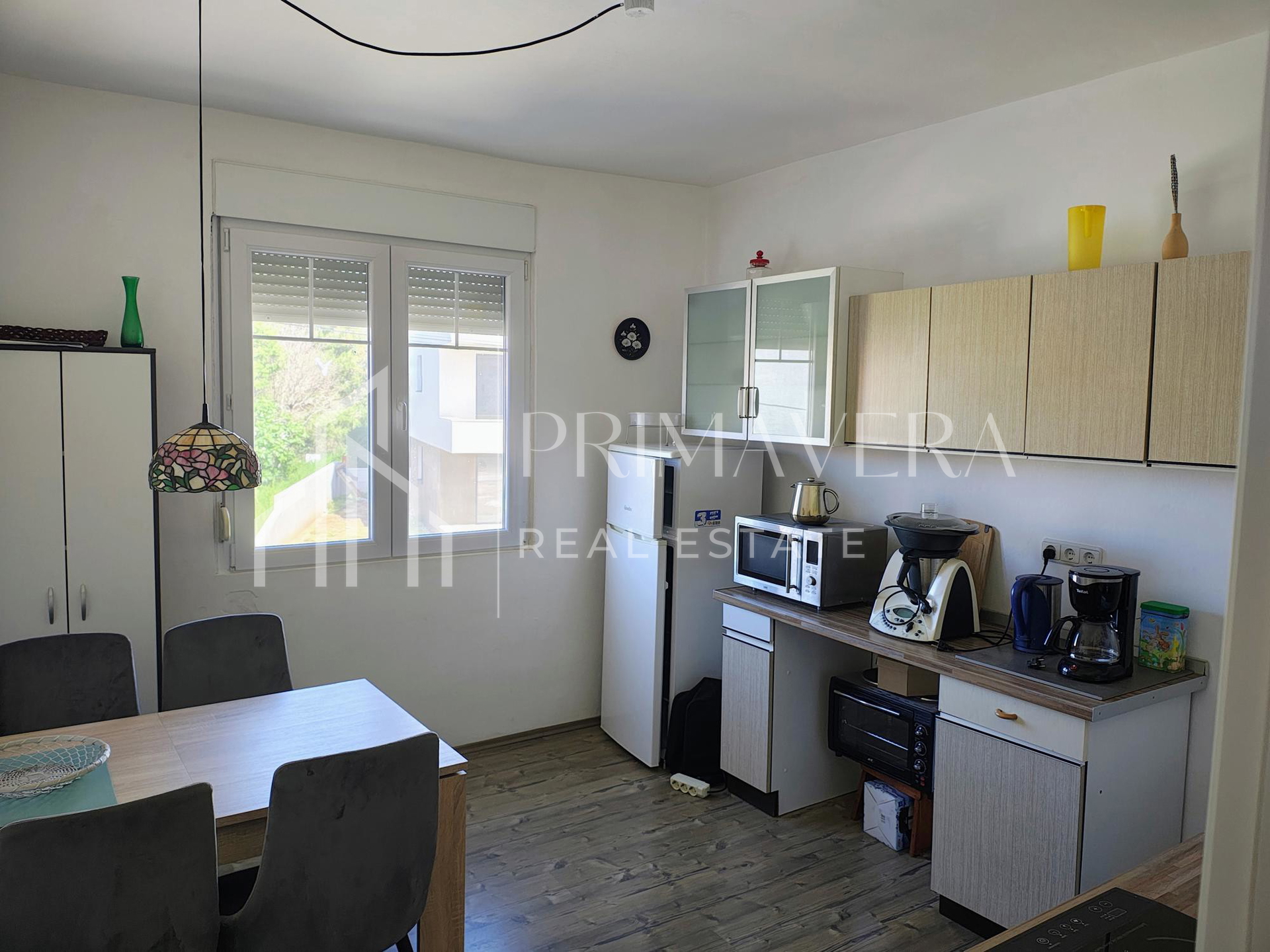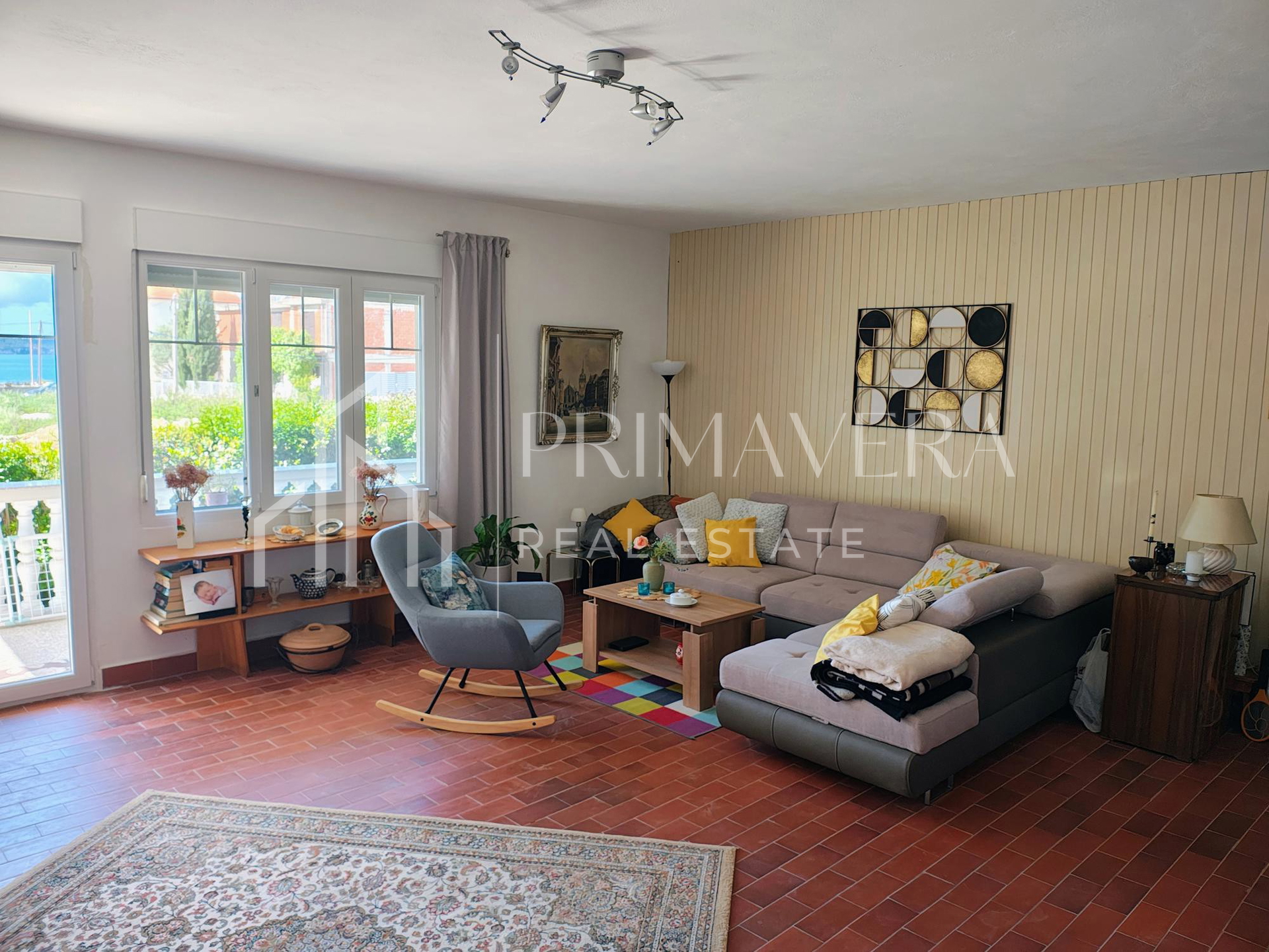 Na prizemlju kuće se nalazi stan koji sadrži prostrani hodnik, kupaonicu, wc, kuhinju s blagovaonicom koja je povezana s dnevnim boravkom, izlaz na terasu te jednu veliku spavaću sobu. Kat sadrži kuhinju, dnevni boravak, kupaonicu, zasebni wc, 3 veće spavaće sobe s balkonom i pogledom na more te 1 manju sobu. Potkrovlje sadrži spremište s mogućnošću uređenja te krovnu terasu s pogledom na more. 2022. godine promijenjeno je kompletno krovište, kupaonice, unutarnja vrata i pvc prozori te je obnovljena fasada. Nova kuhinja je ugrađena 2019. Stanovi su klimatizirani, a na prizemlju je ugrađena peć na kruta goriva. Kuća je potpuno namještena i prodaje se s namještajem.
