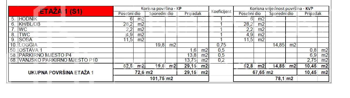 - 1 vanjsko parkirno mjesto (13,75 m2 bruto, 2,75 m2 netto)