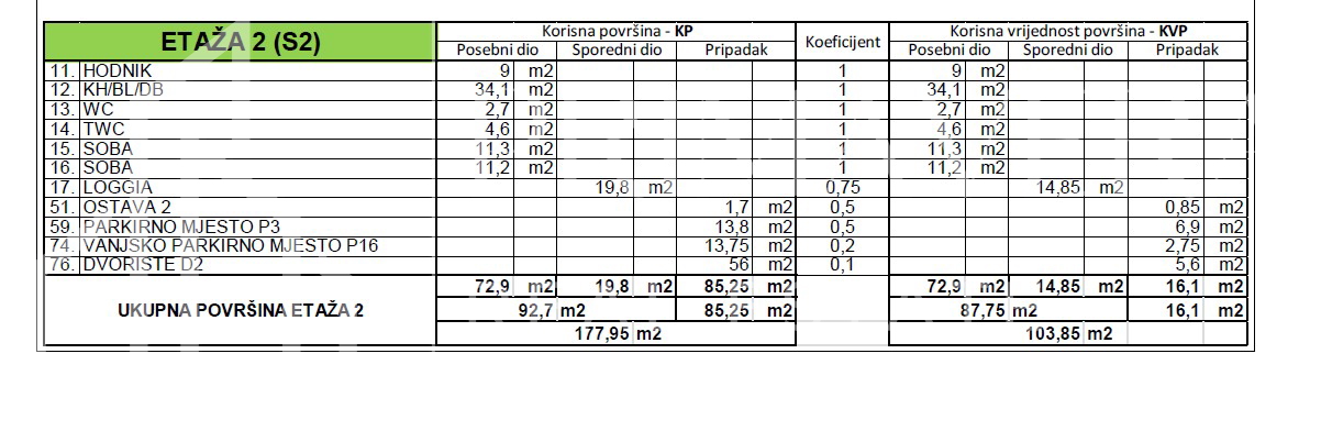 - 1 vanjsko parkirno mjesto (13,75 m2 bruto, 2,75 m2 netto)