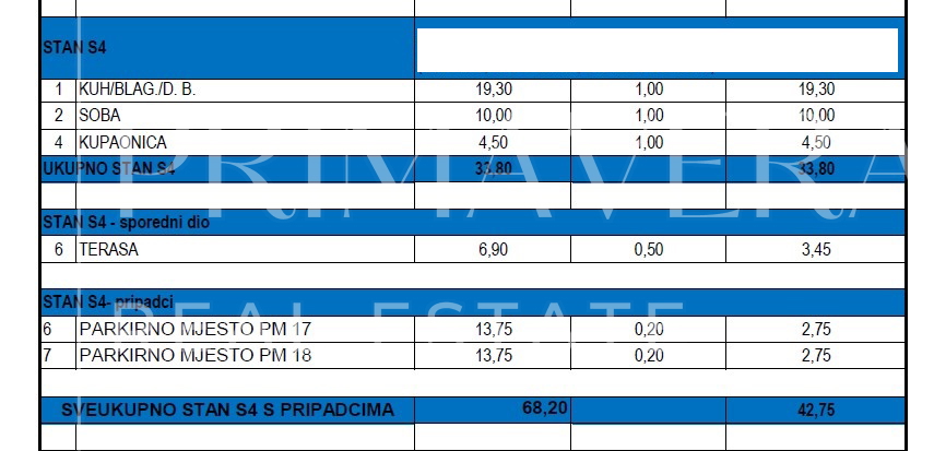 Stan S4, smješten na 1.katu zgrade, sastoji se od kuhinje s blagovaonicom i dnevnim boravkom, kupaonice i natkrivene terase. Stanu pripadaju dva parkirna mjesta. Ukupna korisna površina stana s pripadcima iznosi 42,75 m2.