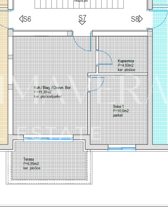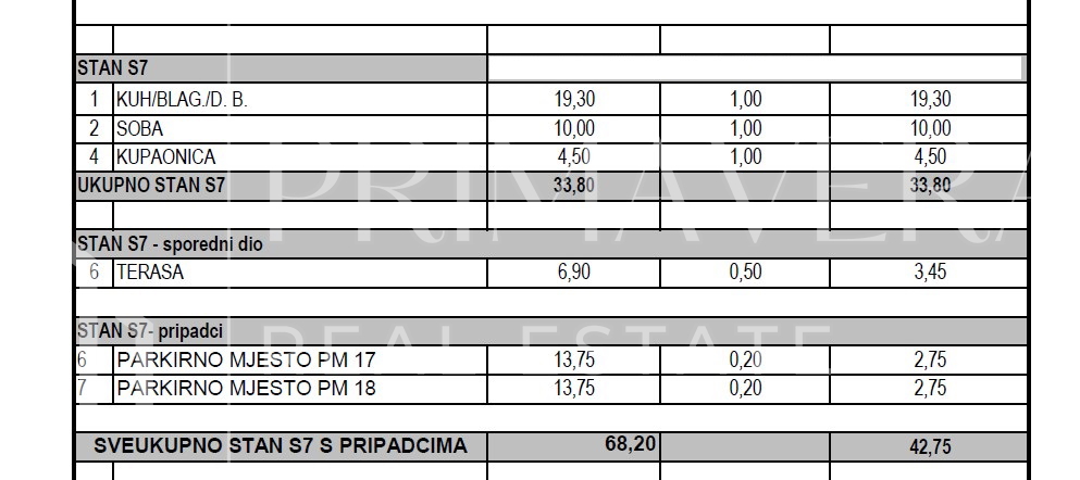 Stan S7, smješten na 2.katu zgrade, sastoji se od kuhinje s blagovaonicom i dnevnim boravkom, kupaonice i natkrivene terase. Stanu pripadaju dva parkirna mjesta. Ukupna korisna površina stana s pripadcima iznosi 42,75 m2.