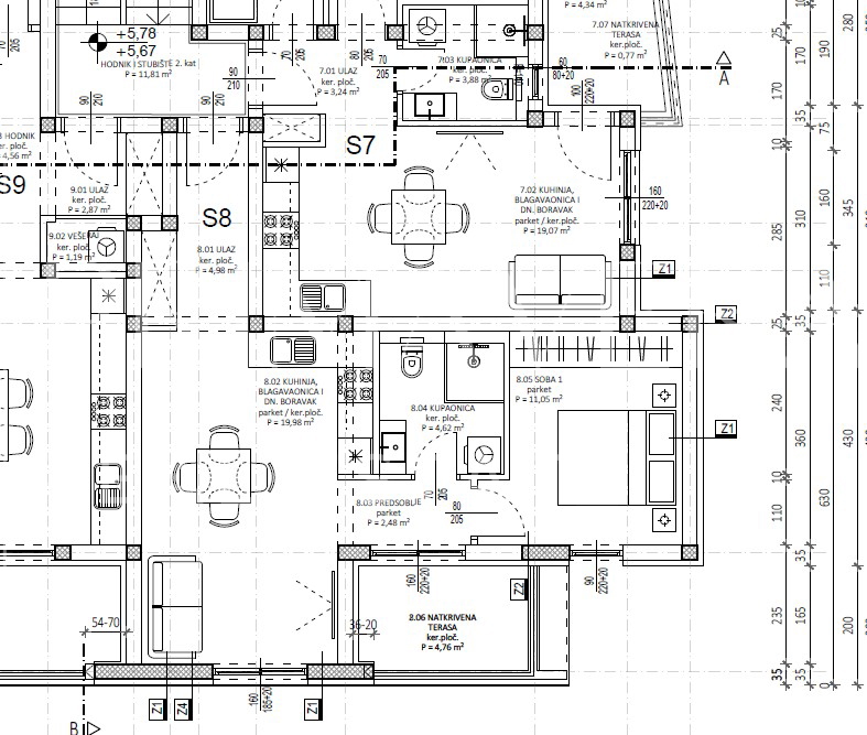 Jednosoban stan oznake S8 na 2. katu zgrade, s krovnom terasom, a sadrži: hodnik (pov. 4.98 m2), dnevni boravak s blagovaonicom i kuhinjom (pov. 19.98 m2), predsoblje (pov. 2.40 m2), spavaću sobu (pov. 11.05 m2), kupaonicu (pov. 4.62 m2) i natkrivenu terasu (pov. 5.11 m2). Ukupna stambena površina iznosi 46,86 m2.