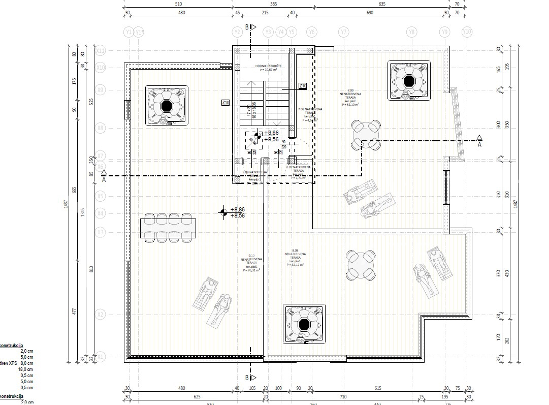 Zgrada sadrži podrum, prizemlje i dva kata, sa ukupno 9 stambenih jedinica, po tri na svakoj etaži. Stanovi u prizemlju imaju pripadajuće vrtove, a stanovi na 2. katu vlastite krovne terase. Svim stanovima pripadaju po dva vanjska parkirna mjesta i ostava u podrumu zgrade. Na krovnim terasama biti će pripremljene vodovodne instalacije te priprema za postavljanje jacuzzija. Vanjska stolarija biti će PVC s troslojnim staklom, s komarnicima i električnim podizačima roleta. Ulazna vrata biti će protuprovalna i protupožarna s videoportafonom. Podno grijanje u cijelom stanu te klima uređaji u svim prostorijama. U stanovima je predviđen i dimnjak. Podovi se oblažu vrhunskom talijanskom keramikom. Moguć odabir parketa za spavaće sobe. Termoizolacija zgrade debljine 10cm, što će rezultirati energetskim certifikatom A kategorije. Osigurano je korištenje visokokvalitetnih materijala, u skladu s najvišim standardima gradnje. Završetak projekta i useljenje predviđeno je do ljeta 2026. godine.