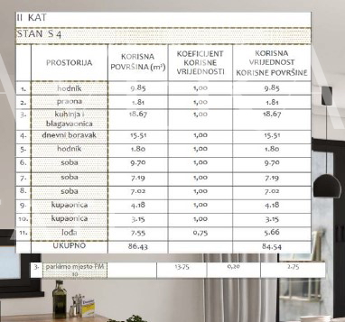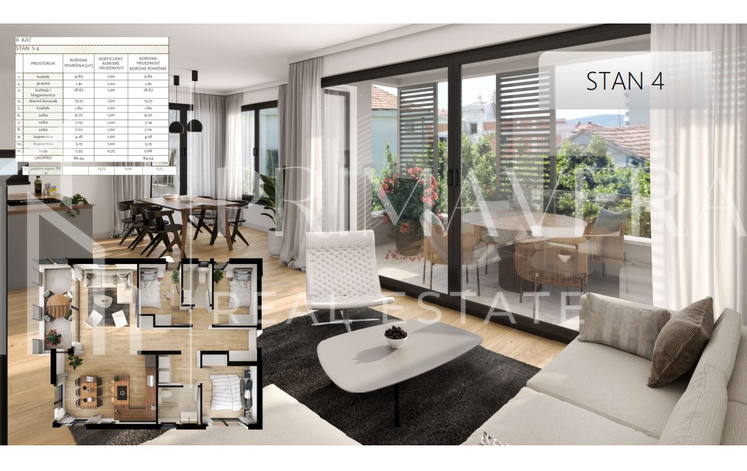 STAN S4, smješten na 2. katu zgrade, sastoji se od hodnika - 9,85 m2, praonice – 1,81 m2, kuhinje, blagovaonice i dnevnog boravka otvorenog koncepta – 34,18 m2, lođe – 7,55m2 (neto 5,66 m2), tri spavaće sobe – 9,70 m2, 7,19 m2 i 7,02 m2, dvije kupaonice – 4,18 m2 i 3,15 m2 i predsoblja – 1,80 m2. Ukupna stambena površina stana iznosi 84,54 m2.