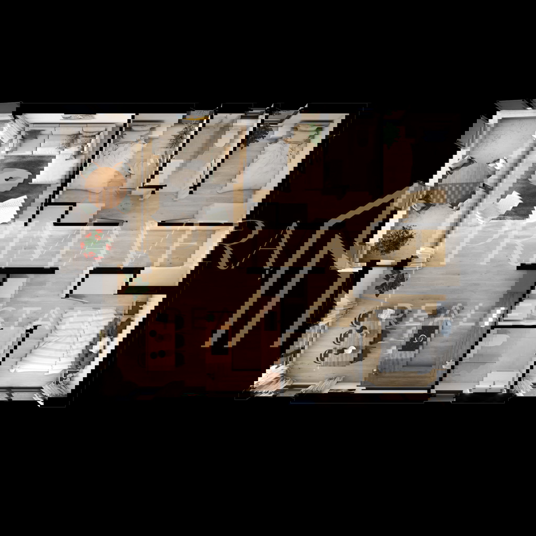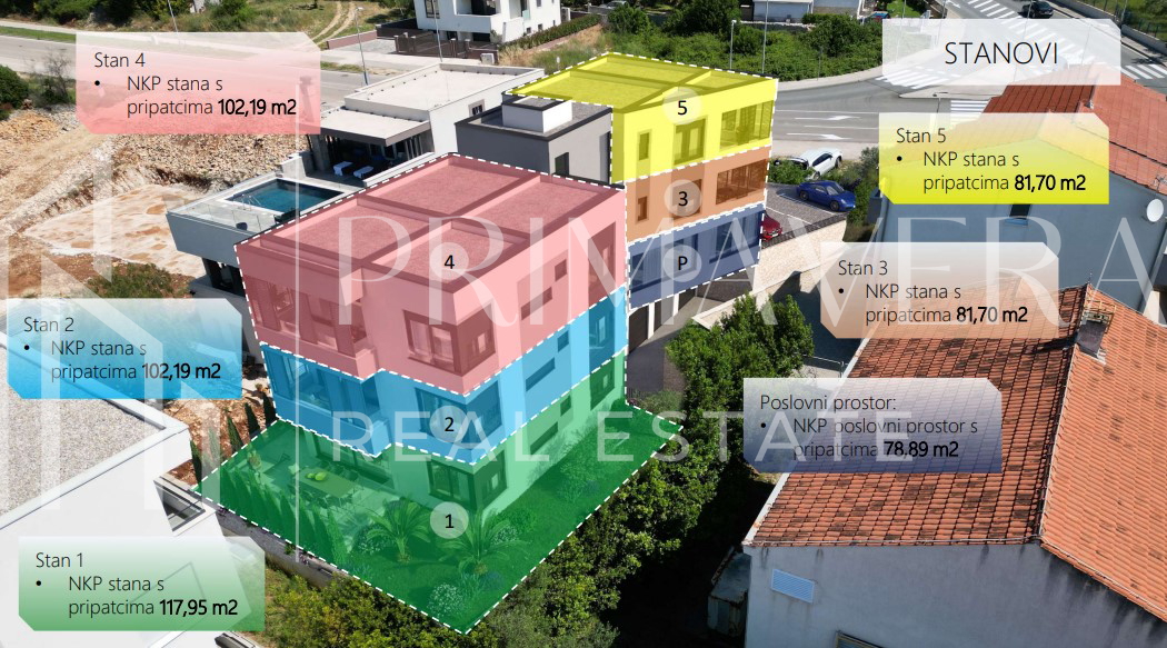 Stambene jedinice raspoređene su kroz tri etaže, prizemlje, prvi i drugi kat. U prizemlju se nalazi i poslovni prostor. Zgrada sadrži i podzemnu garažu sa četiri garažna parkirna mjesta i tri garaže.