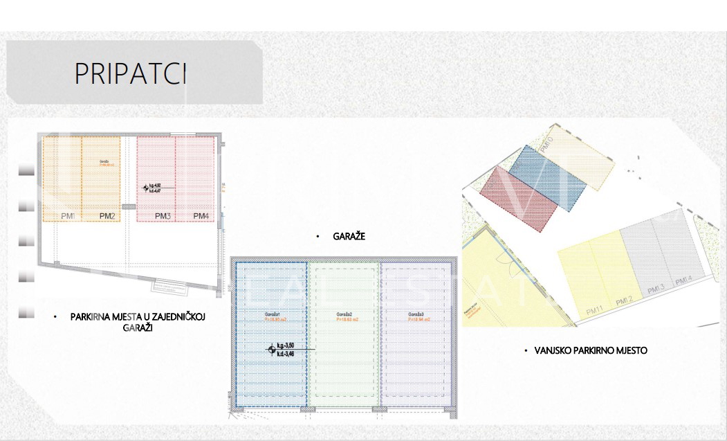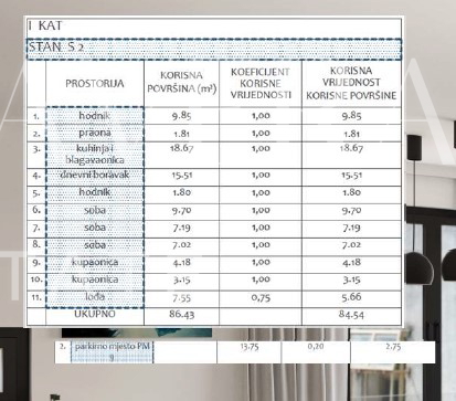 Stanu pripada vanjsko parkirno mjesto i vlastita garaža. Ukupna korisna površina stana s pripadcima iznosi 119,18 m2, a sveukupna neto obračunska površina 102,19 m2.
