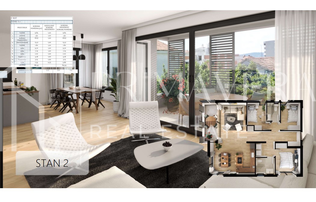 STAN S2, smješten na 1. katu zgrade, sastoji se od hodnika - 9,85 m2, praonice – 1,81 m2, kuhinje, blagovaonice i dnevnog boravka otvorenog koncepta – 34,18 m2, lođe – 7,55m2 (neto 5,66 m2), tri spavaće sobe – 9,70 m2, 7,19 m2 i 7,02 m2, dvije kupaonice – 4,18 m2 i 3,15 m2 i predsoblja – 1,80 m2. Ukupna stambena površina stana iznosi 84,54 m2.