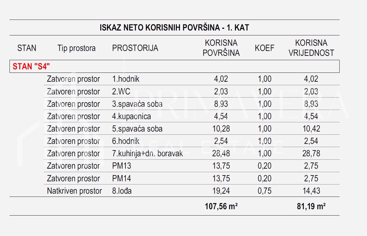 Dvosoban stan oznake S4, smješten na 1. katu zgrade, a sadrži: hodnik, wc, kupaonicu, dnevni boravak s blagovaonicom i kuhinjom, dvije spavaće sobe te lođu. Ukupna stambena površina stana iznosi 75,69 m2. Stanu pripadaju dva vanjska parkirna mjesta. Sveukupna površina stana i svih pripadaka iznosi 107,56 m2, a ukupna neto korisna površina stana i pripadaka iznosi 81,19 m2.